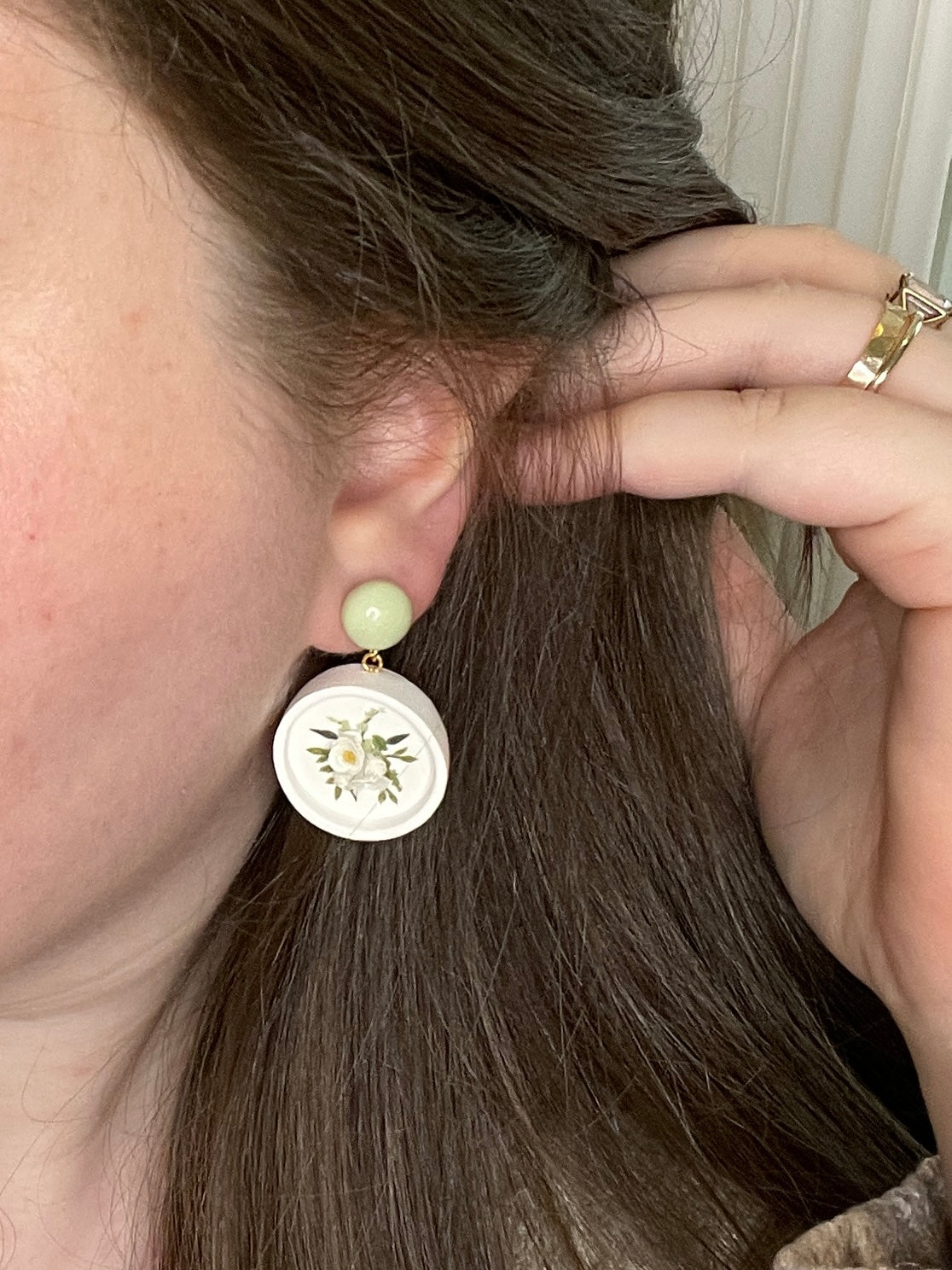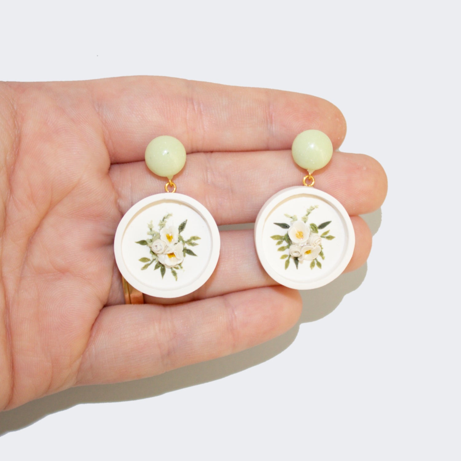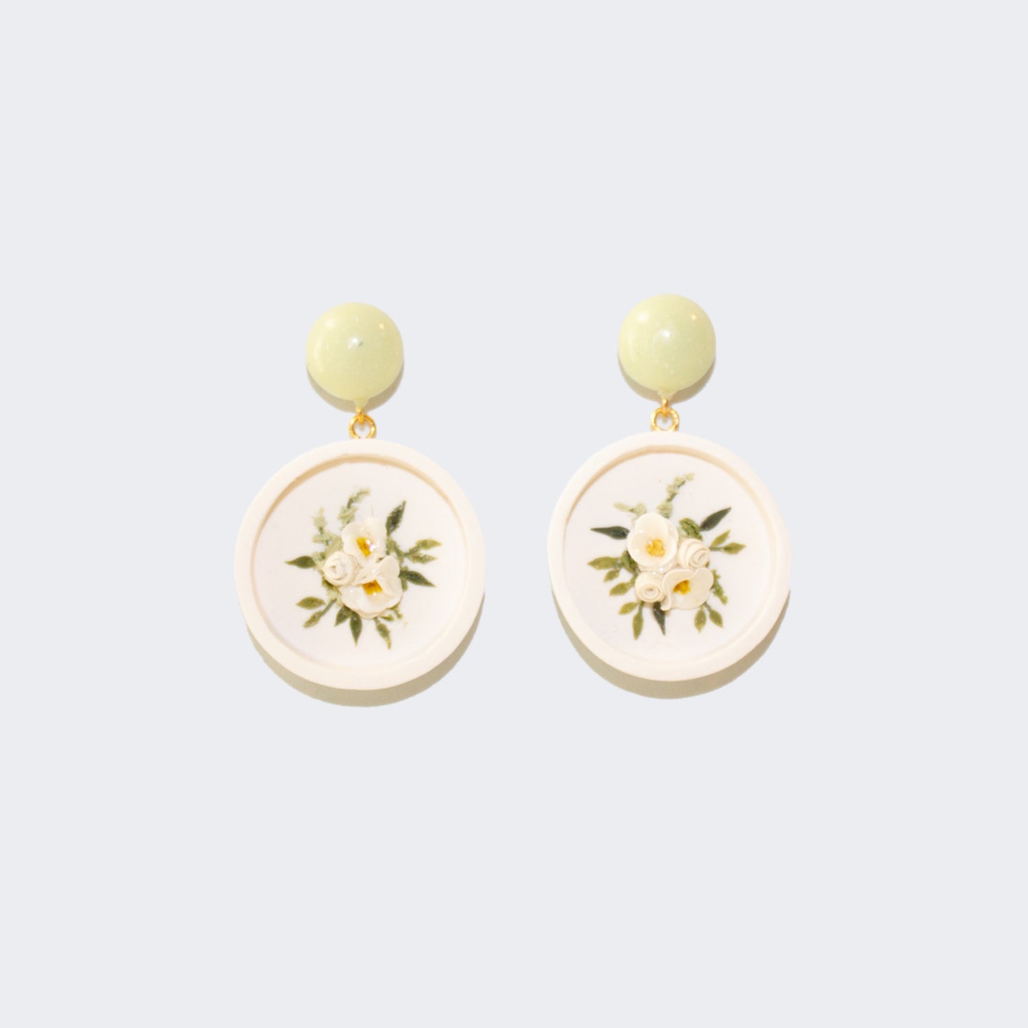 This design features a white, framed, circular base and a bouquet of white and citrine flowers. I leaned into the colors of these earrings, giving them a domed post in a beautiful light sage color. I think it gives them the perfect pop of coordinated color!