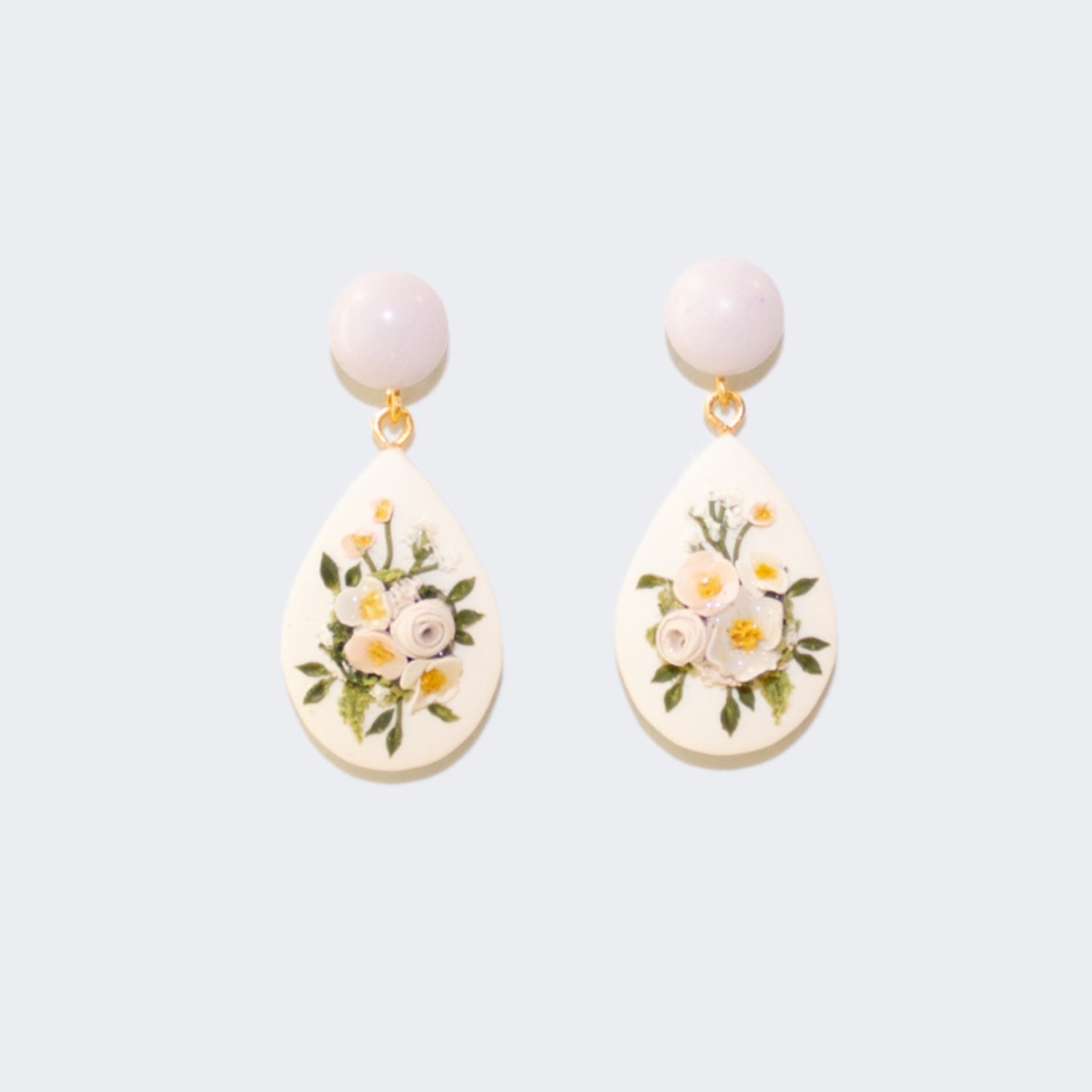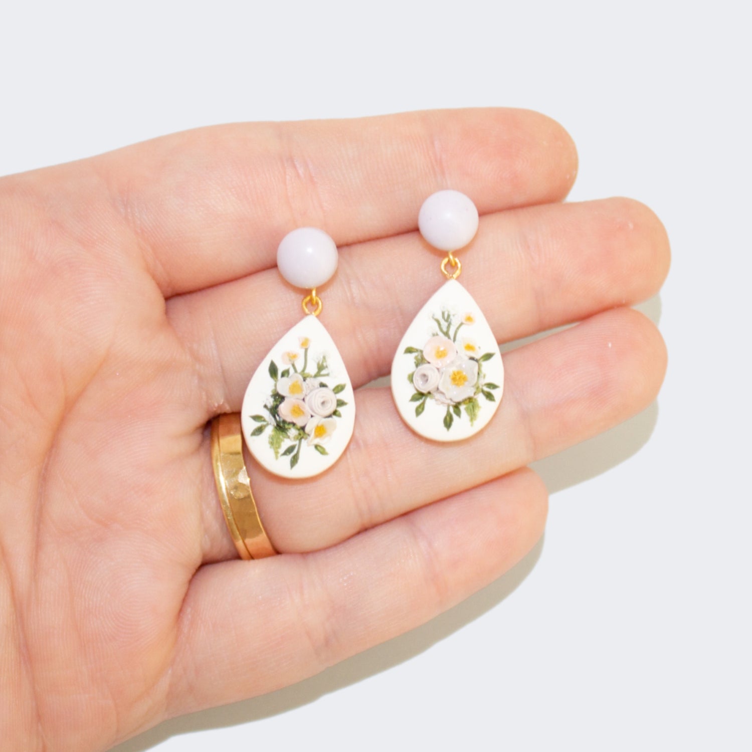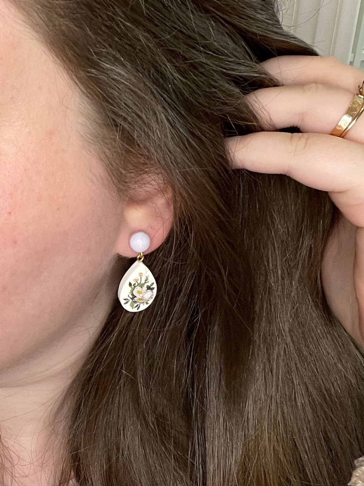 This design features a white base in a teardrop shape and a bouquet of white and lilac flowers. I leaned into the colors of these earrings, giving them a domed post in a beautiful dusty lilac shade. I think it gives them the perfect pop of coordinated color!