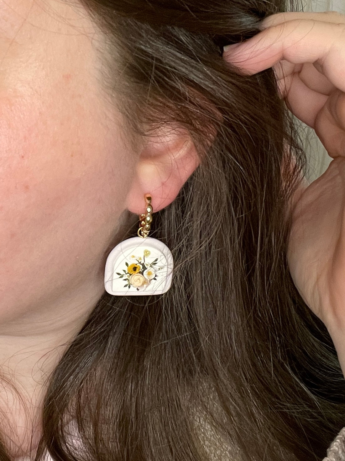 This pair of earrings features a white base, bordered with a tube of lilac clay. The effect is so amazing, they're really unique! The bouquet consists of white and peach flowers accented with deep green foliage.