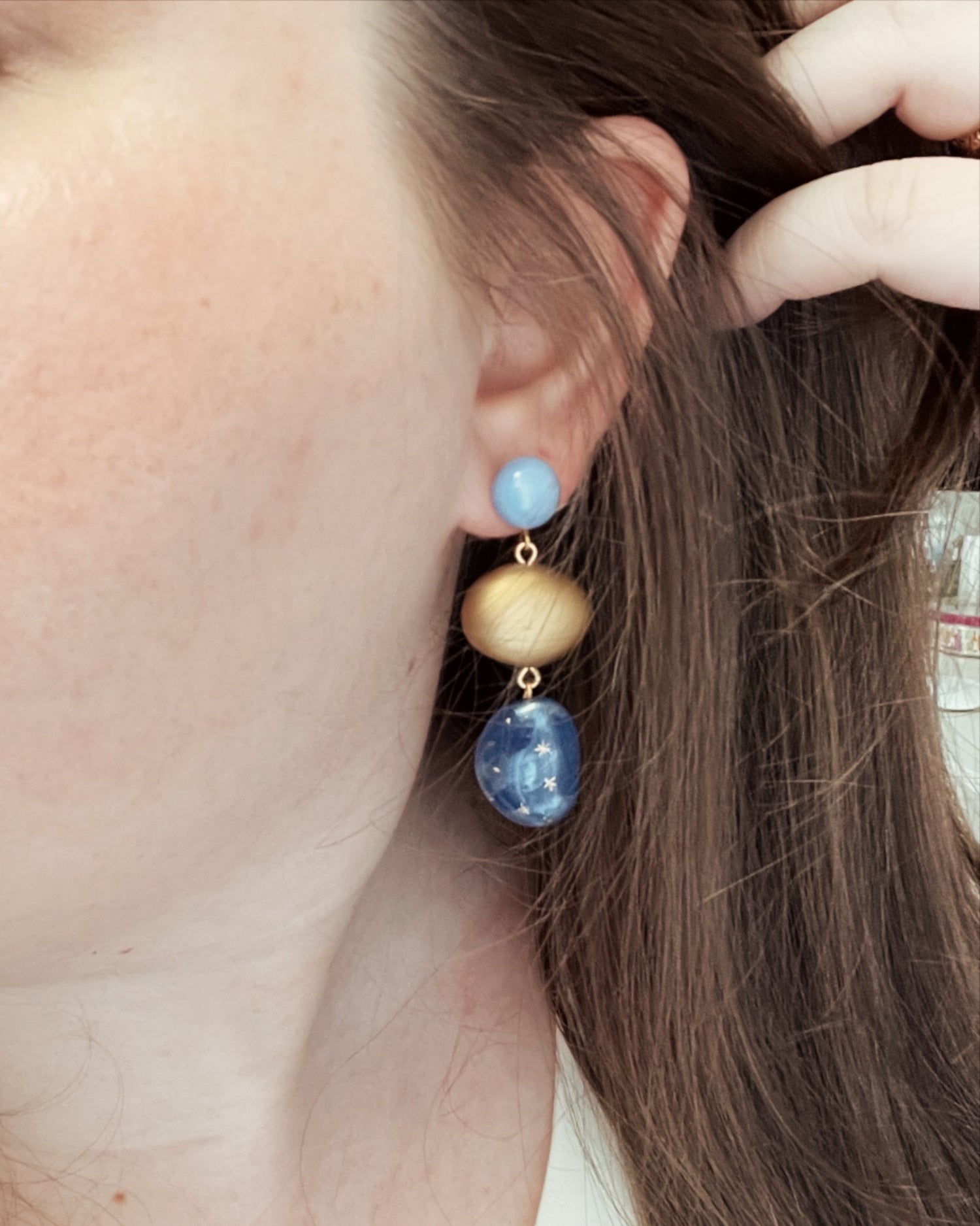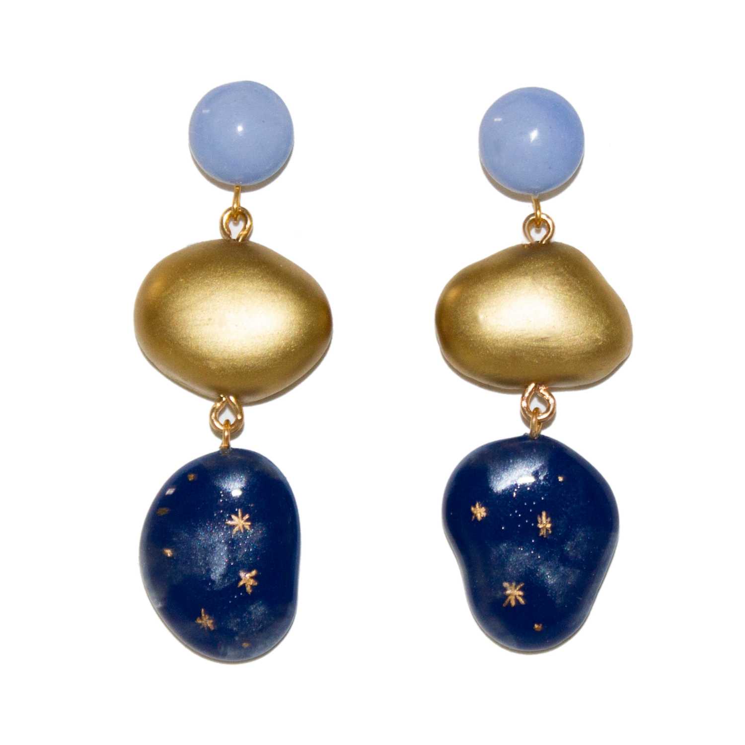 Materials: Polymer clay, resin, gold filled wire, gold paint, titanium earring posts