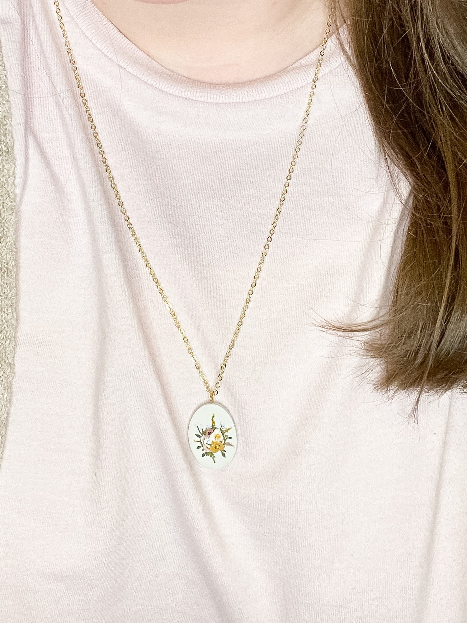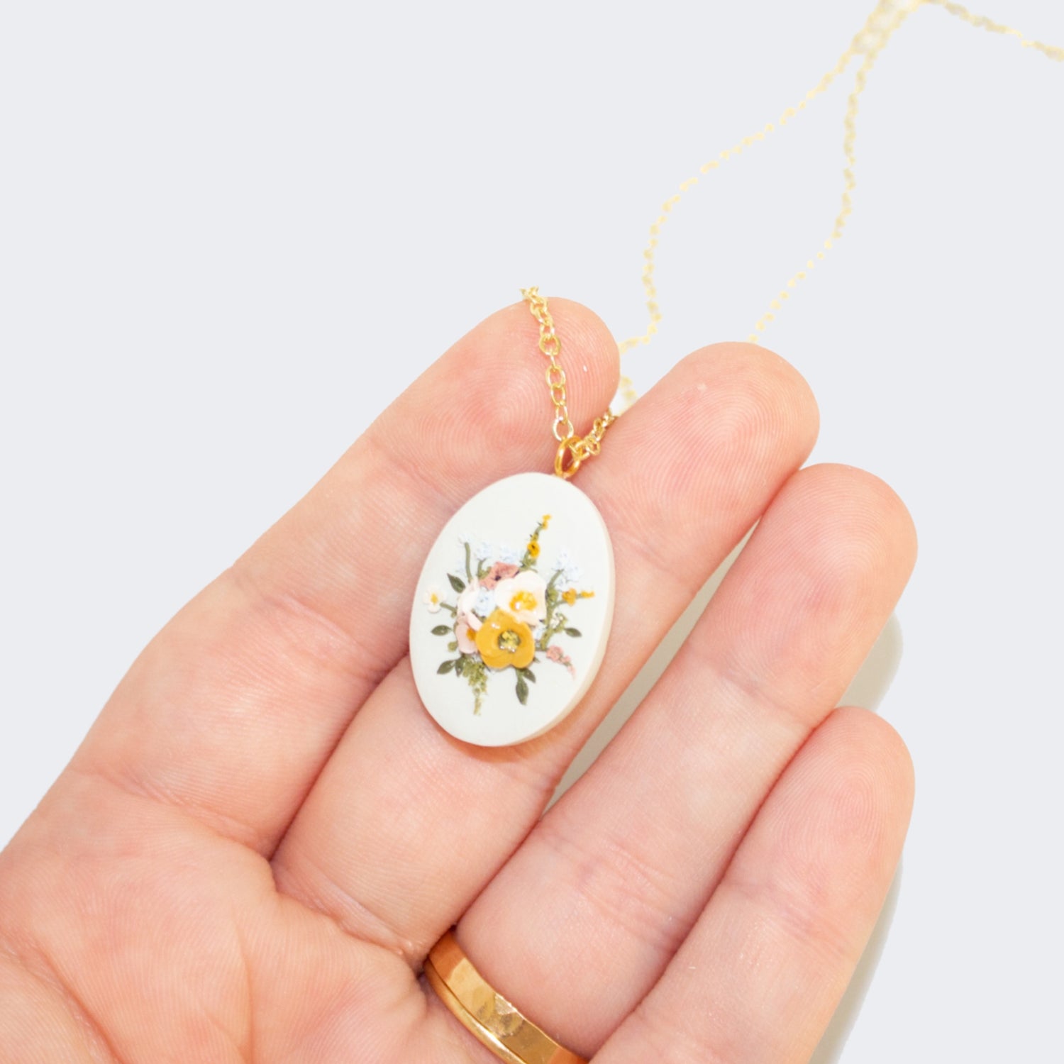 This necklace consists of an oval clay pendant. The pendant itself is a beautiful sky-blue color with a bouquet of pastel flowers and foliage!