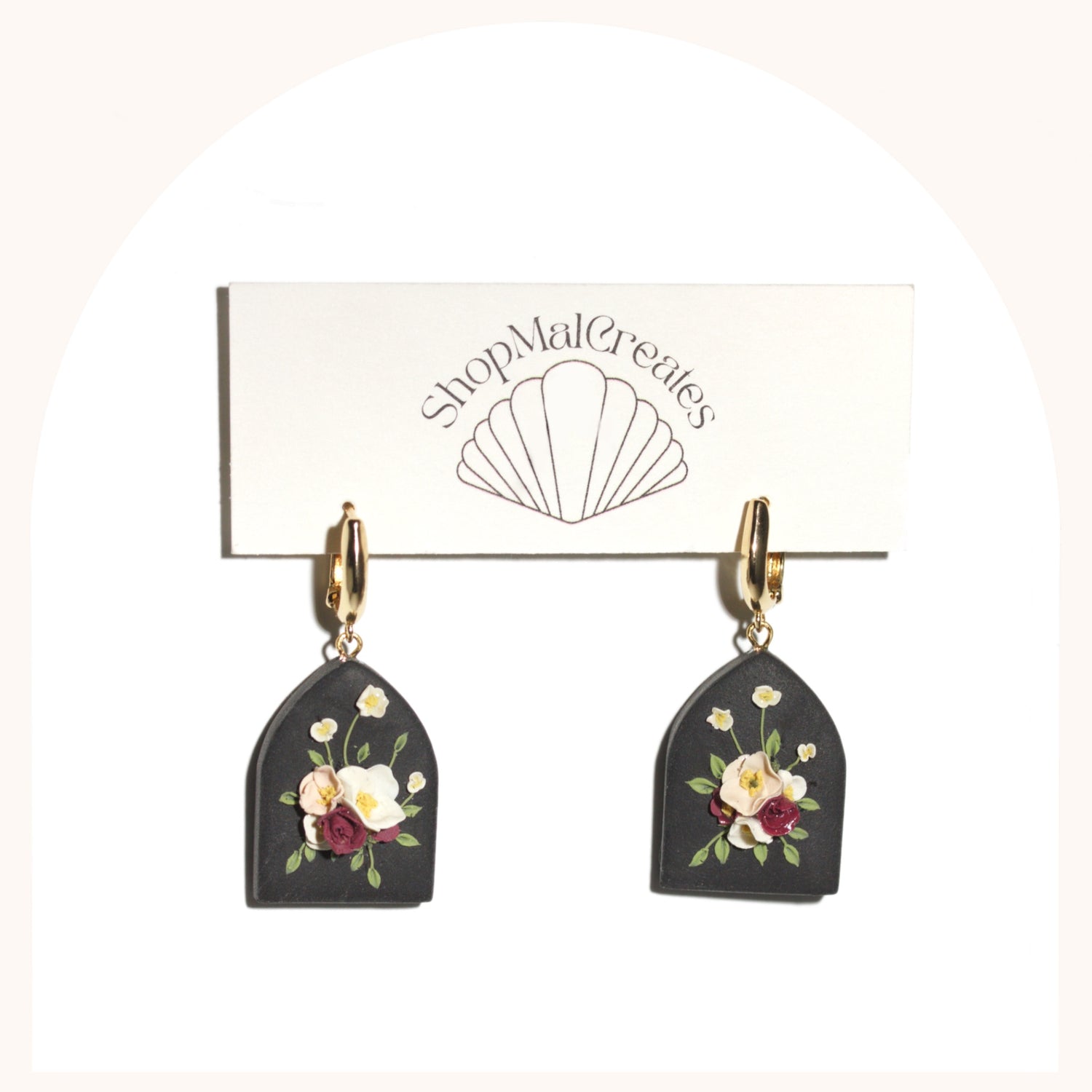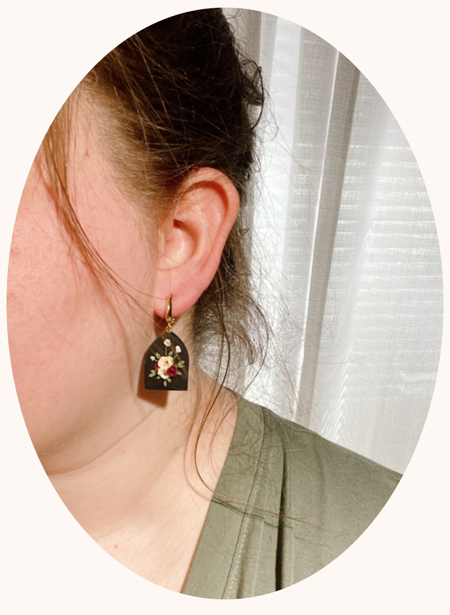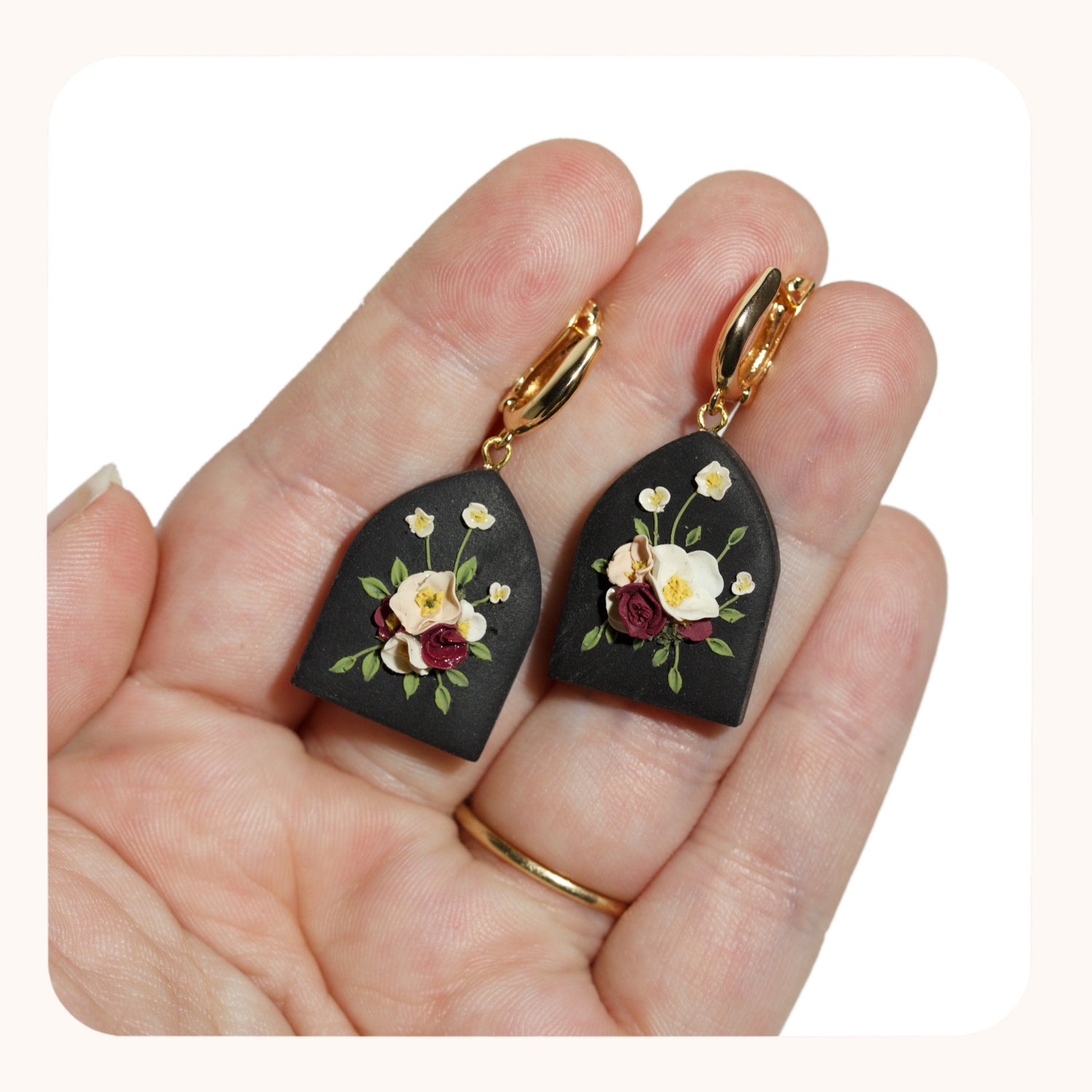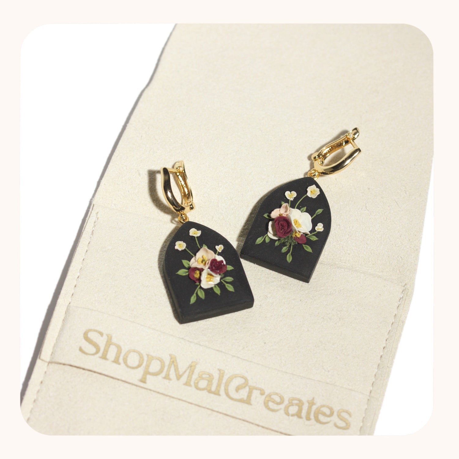 - These earrings are 100% polymer clay. I take special measures to ensure the petals and leaves stay where they're meant to be. I do recommend storing them in a safe place and treating them as you would treat any delicate, handmade jewelry!