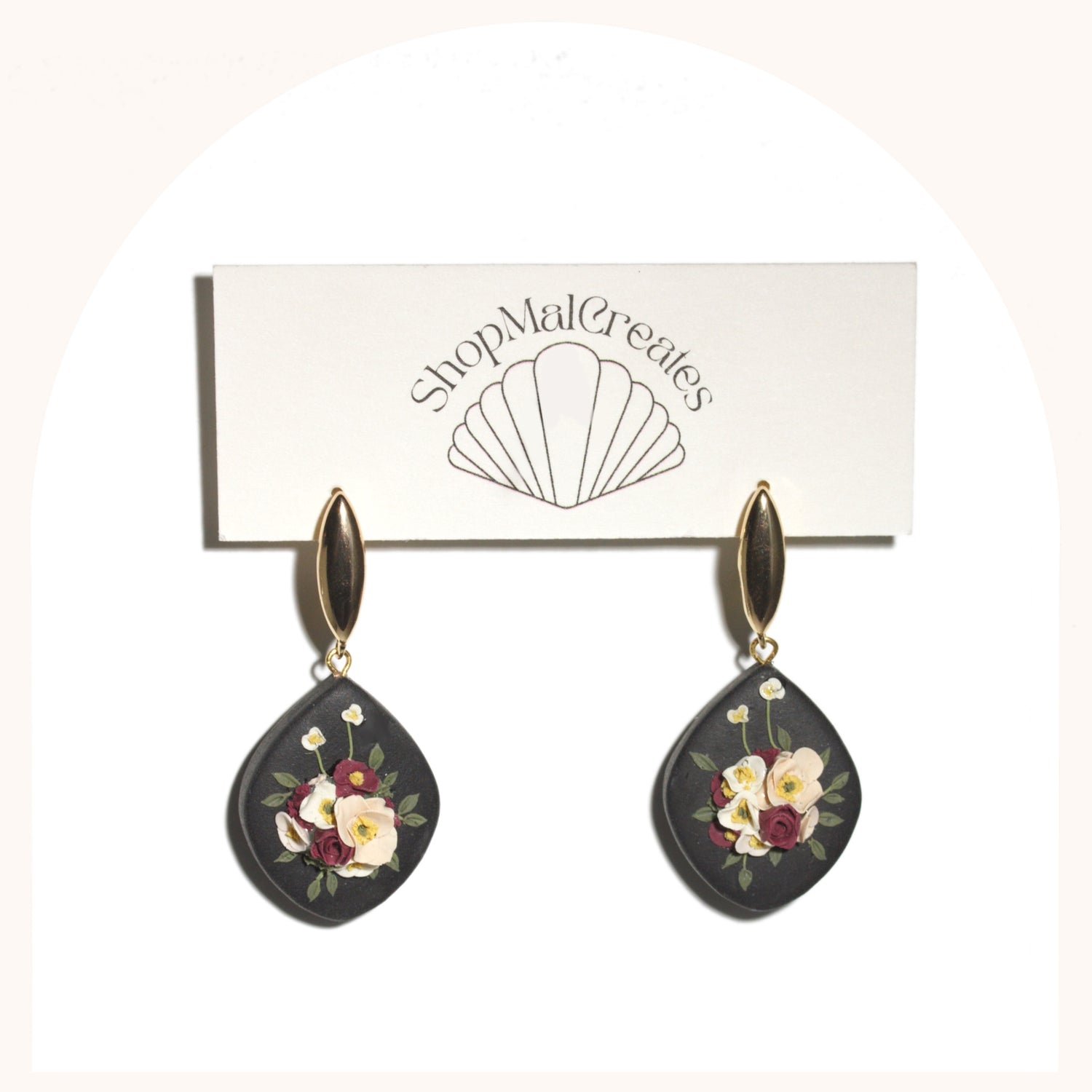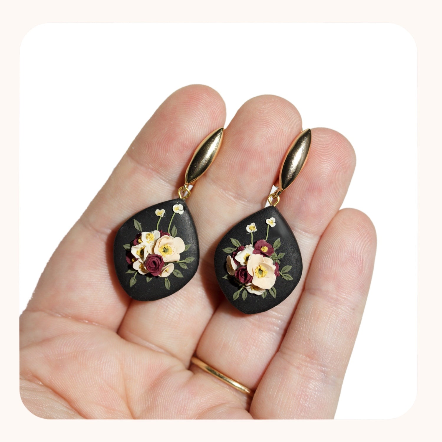 - These earrings are 100% polymer clay. I take special measures to ensure the petals and leaves stay where they're meant to be. I do recommend storing them in a safe place and treating them as you would treat any delicate, handmade jewelry!