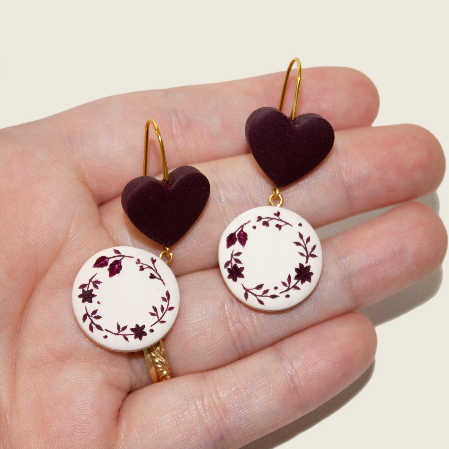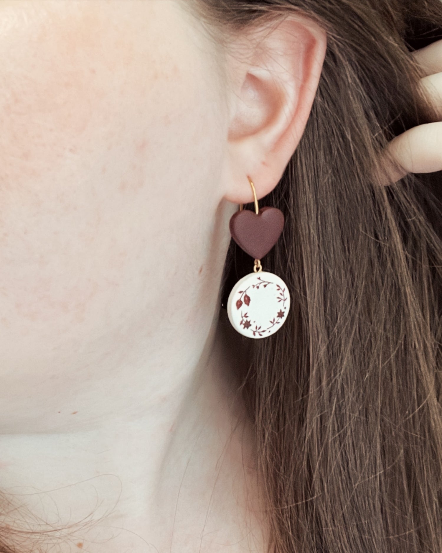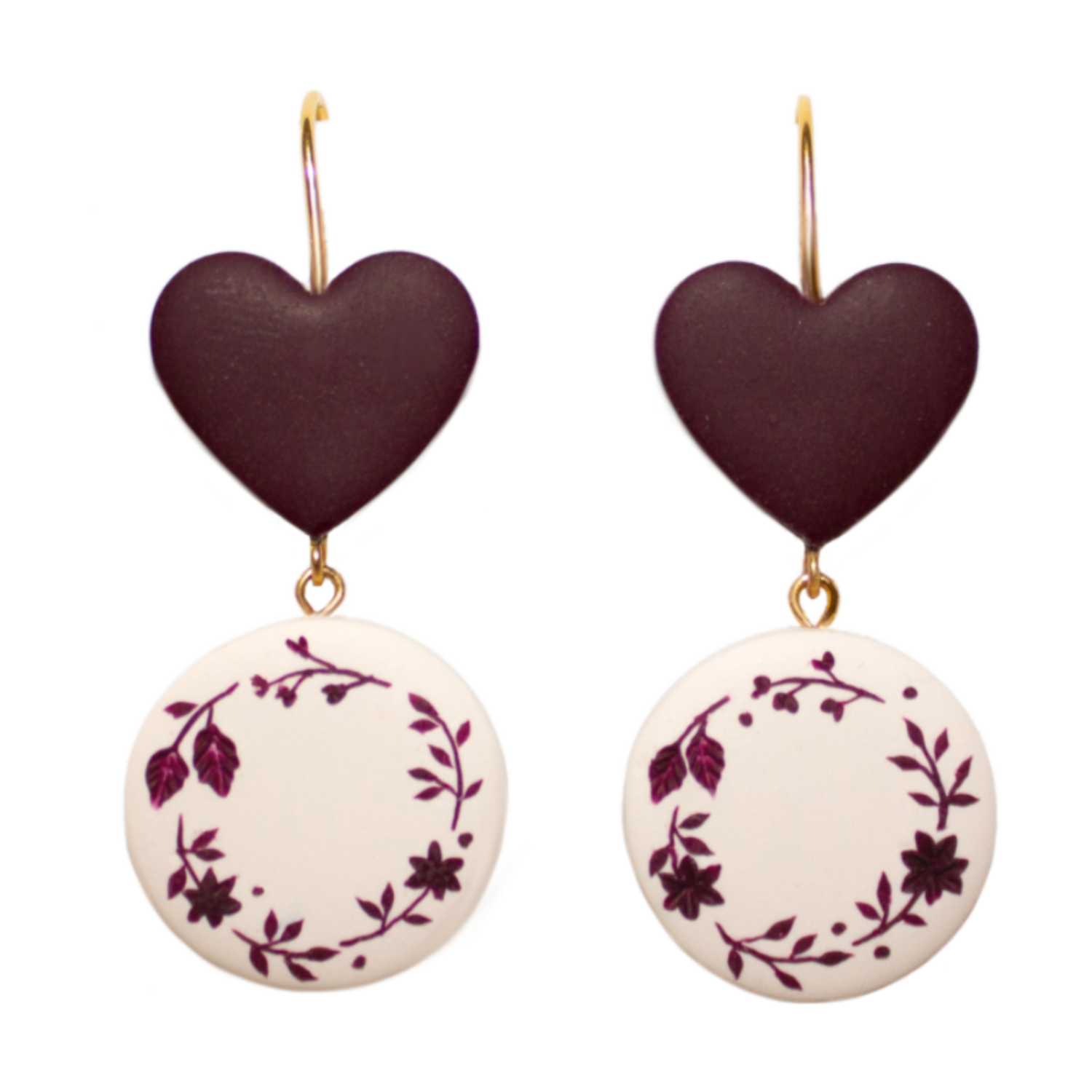 Materials: Polymer clay, resin, gold filled wire, gold filled hook earring posts