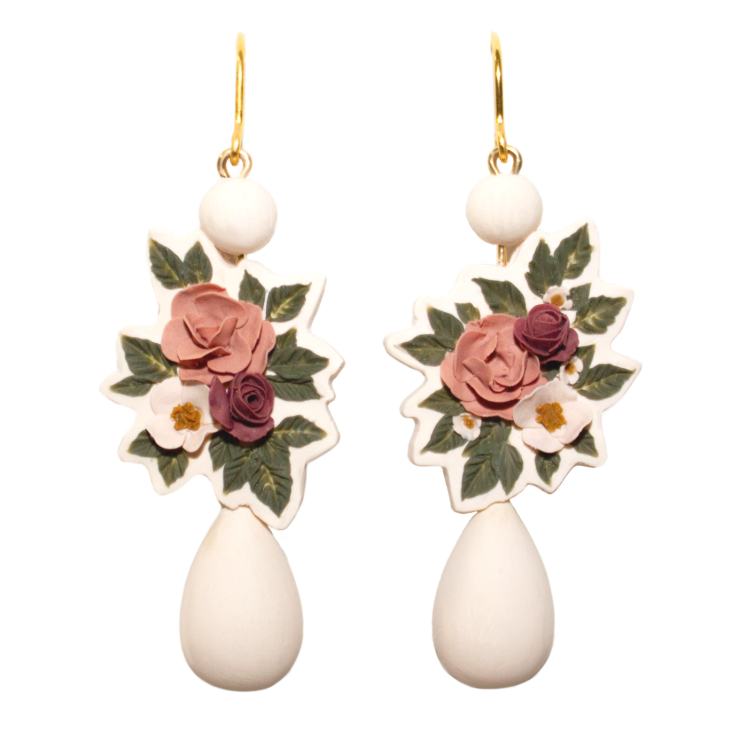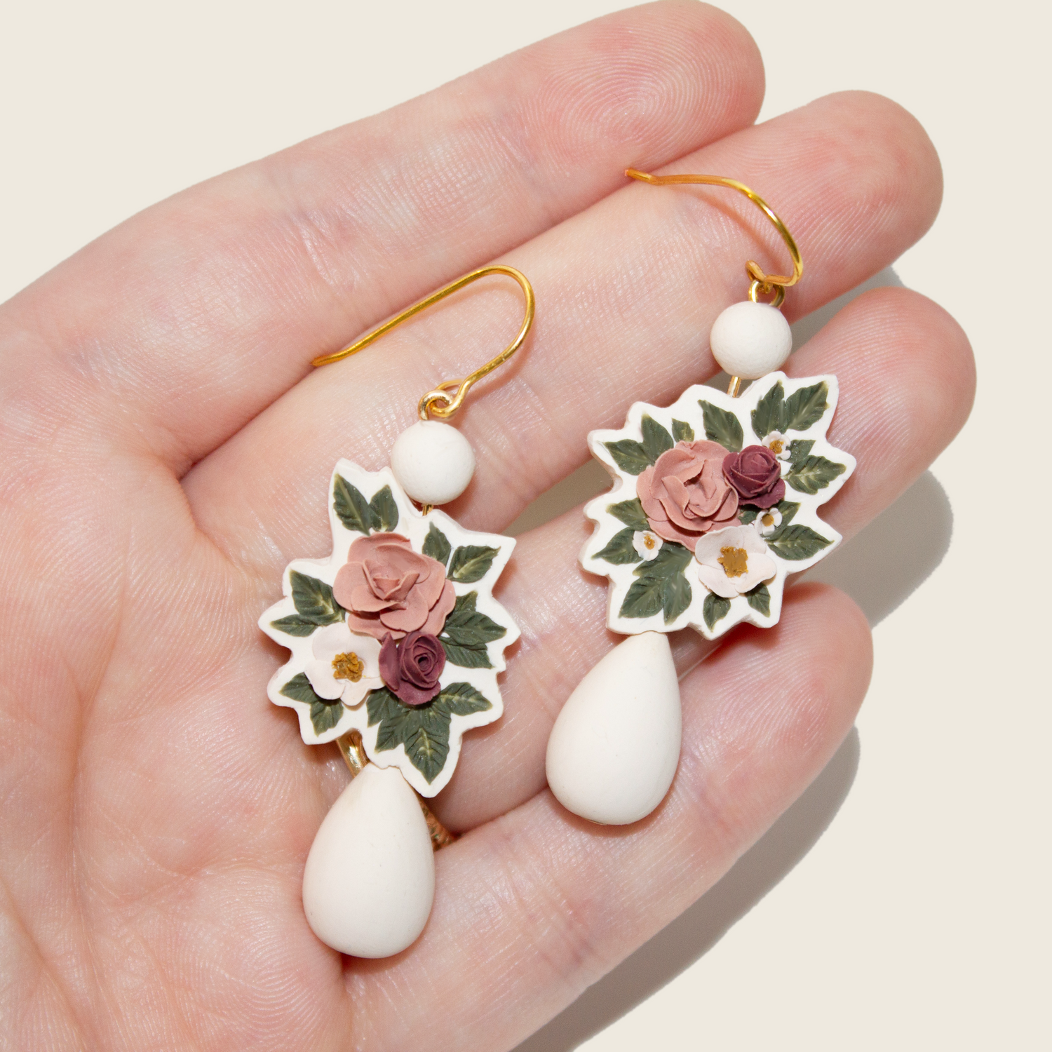 Materials: Polymer clay, resin, gold filled wire, gold filled hook earring posts