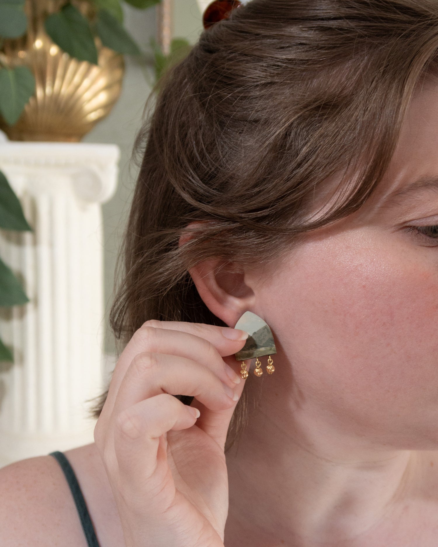 Materials- surgical steel stud, polymer clay, sealant, gold filled wire, gold-toned beads.