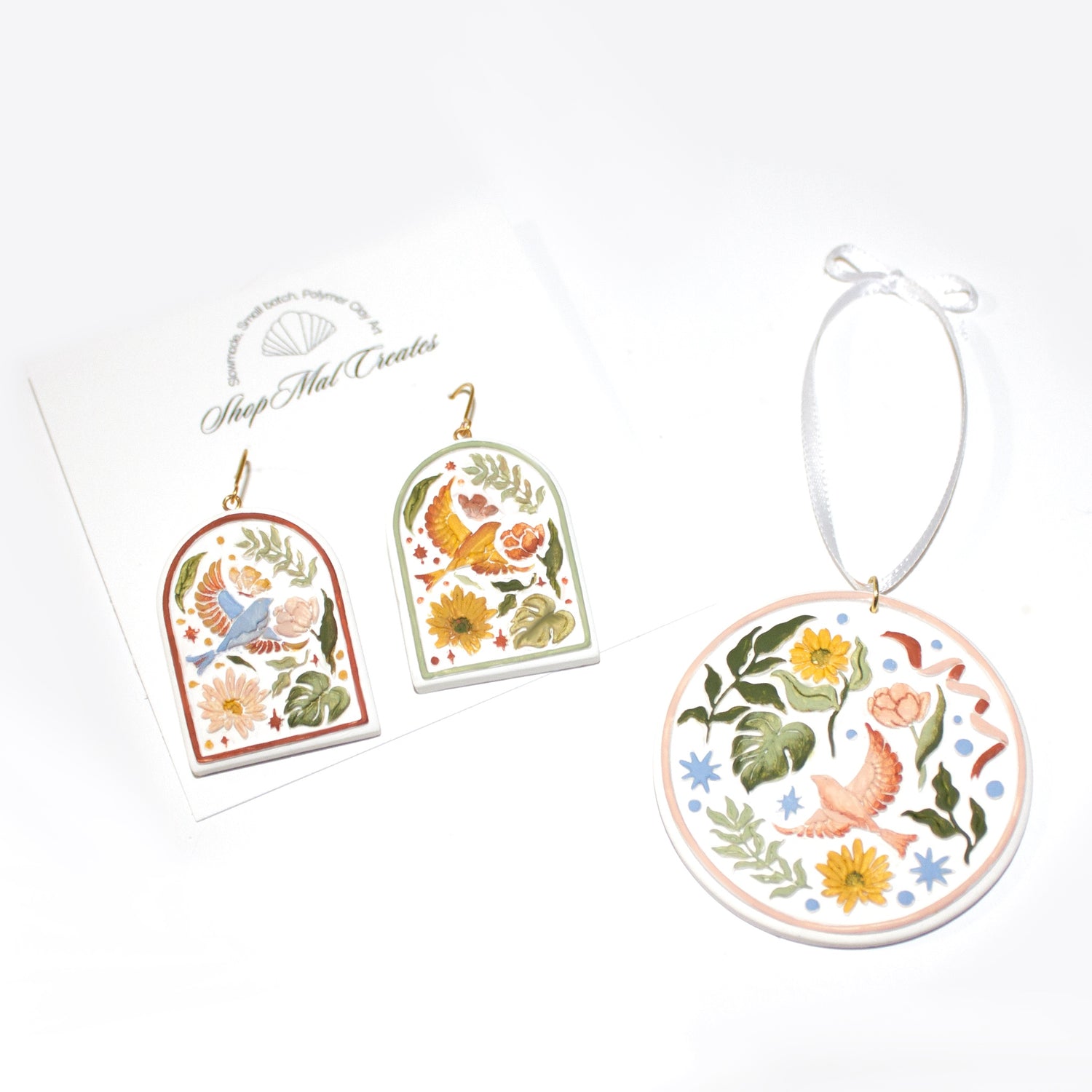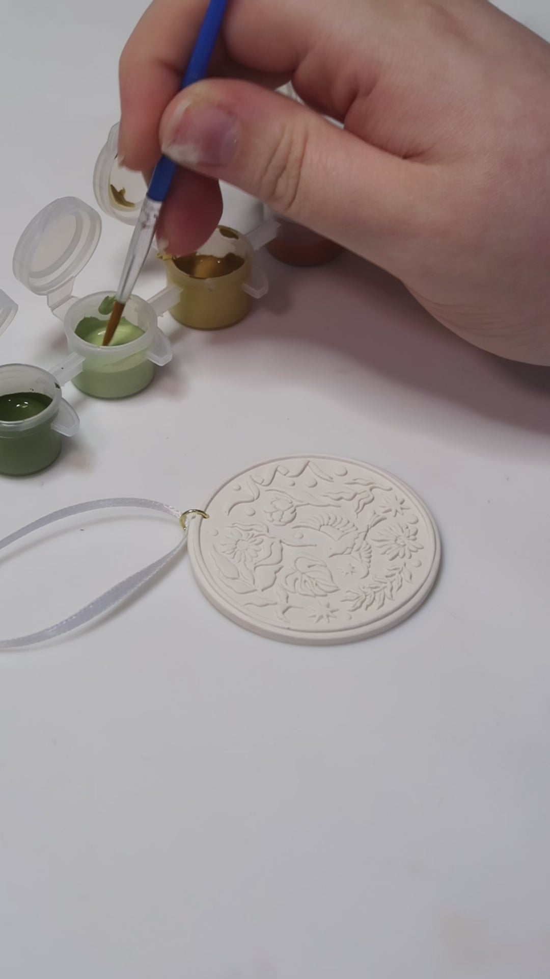 Each kit includes: 1 handmade polymer clay ornament, 1 set of paint capsules, 1 paint brush, 1 toothpick, 1 suction cup hook for hanging and 1 snap string in case you want to switch it out for the ribbon