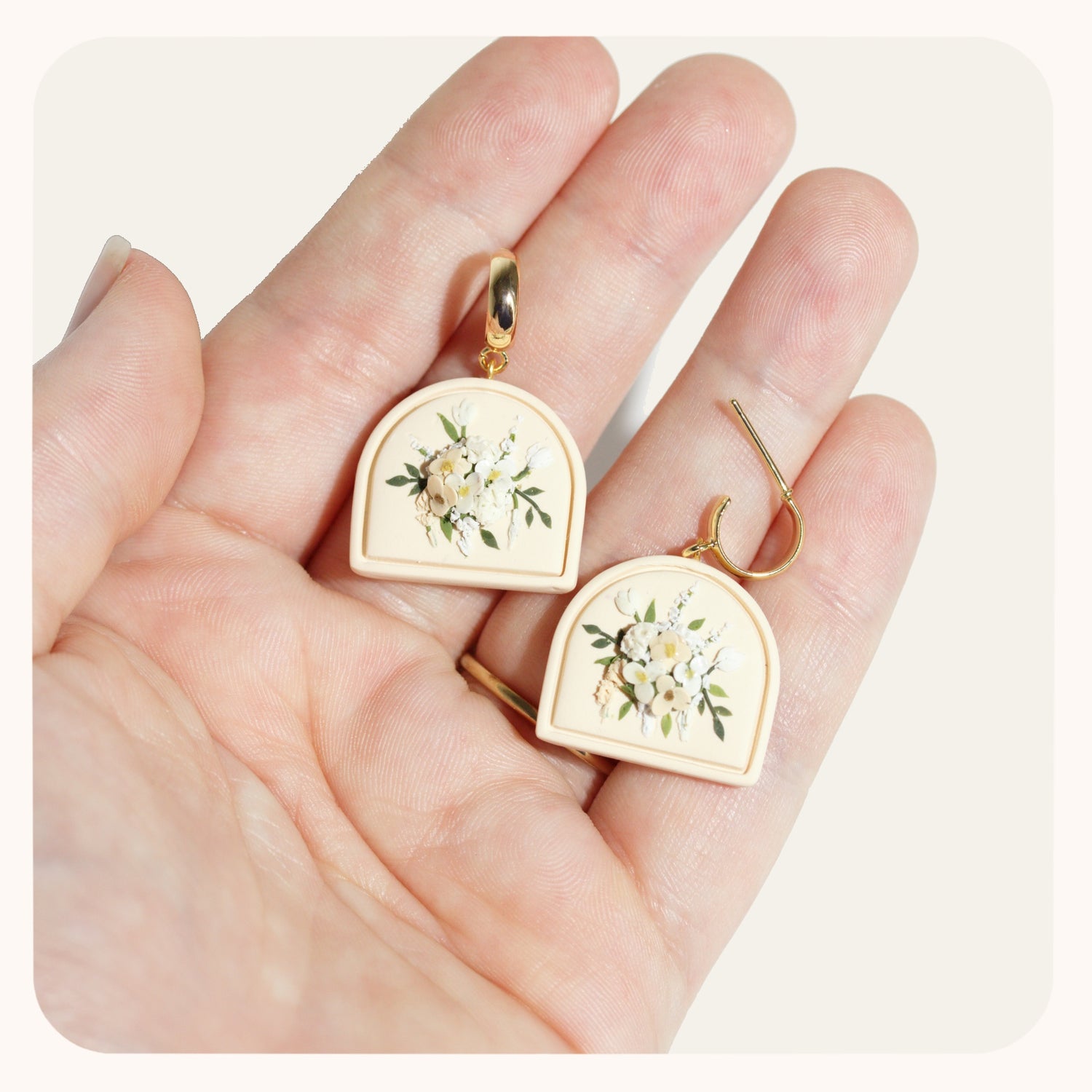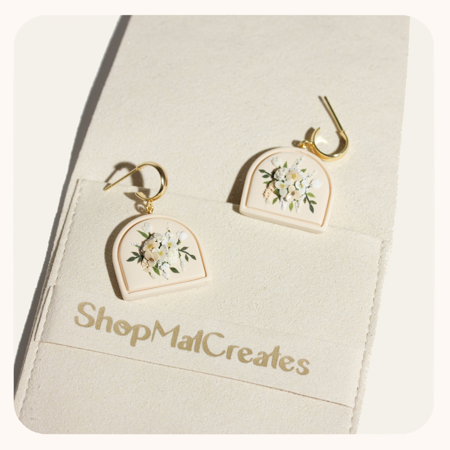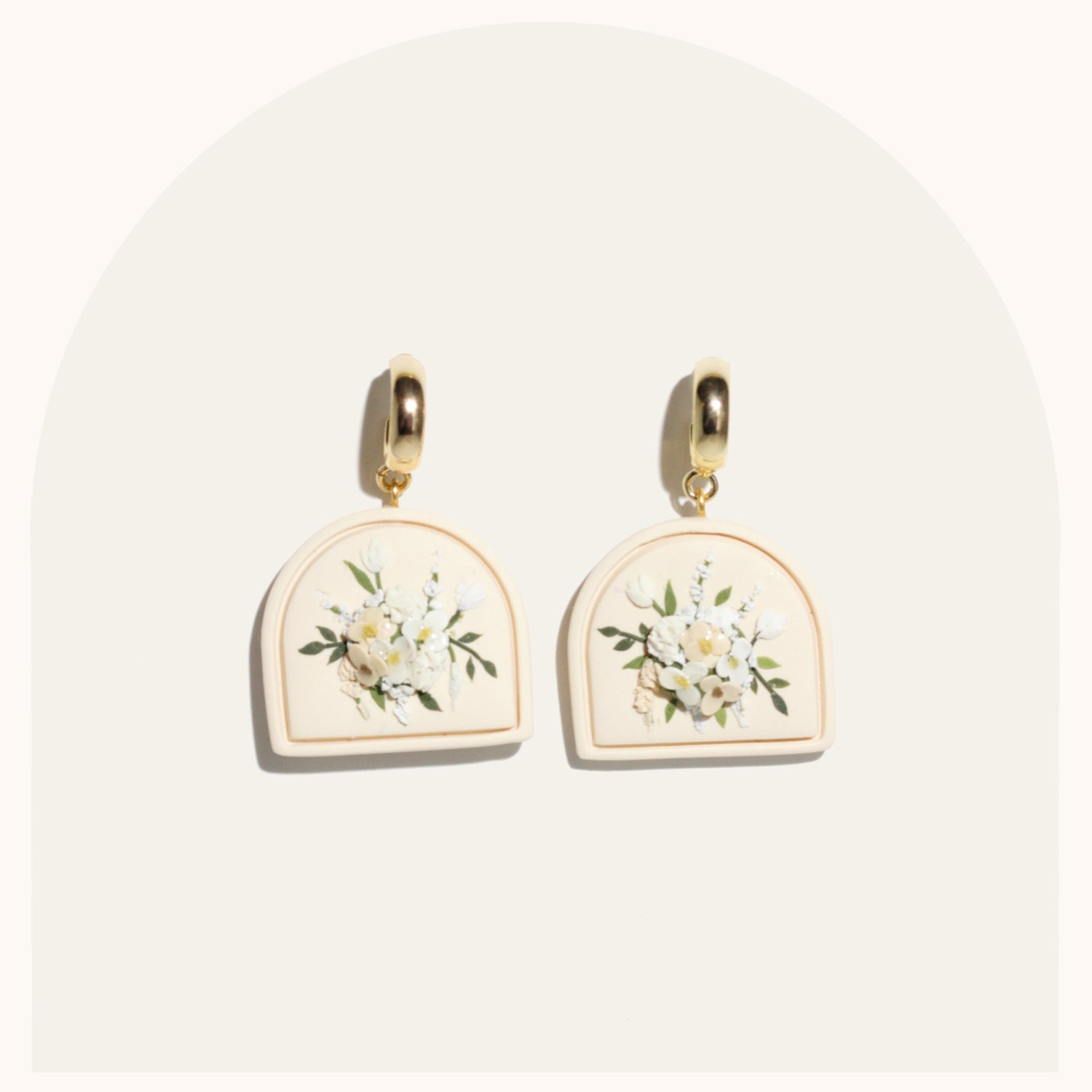 My bouquet earrings are so classic. Each pair is unique, you'll never find a pair that's exactly the same. I spend upwards of 2 hours placing each petal and leaf to make sure the bouquet is cohesive and beautiful.
