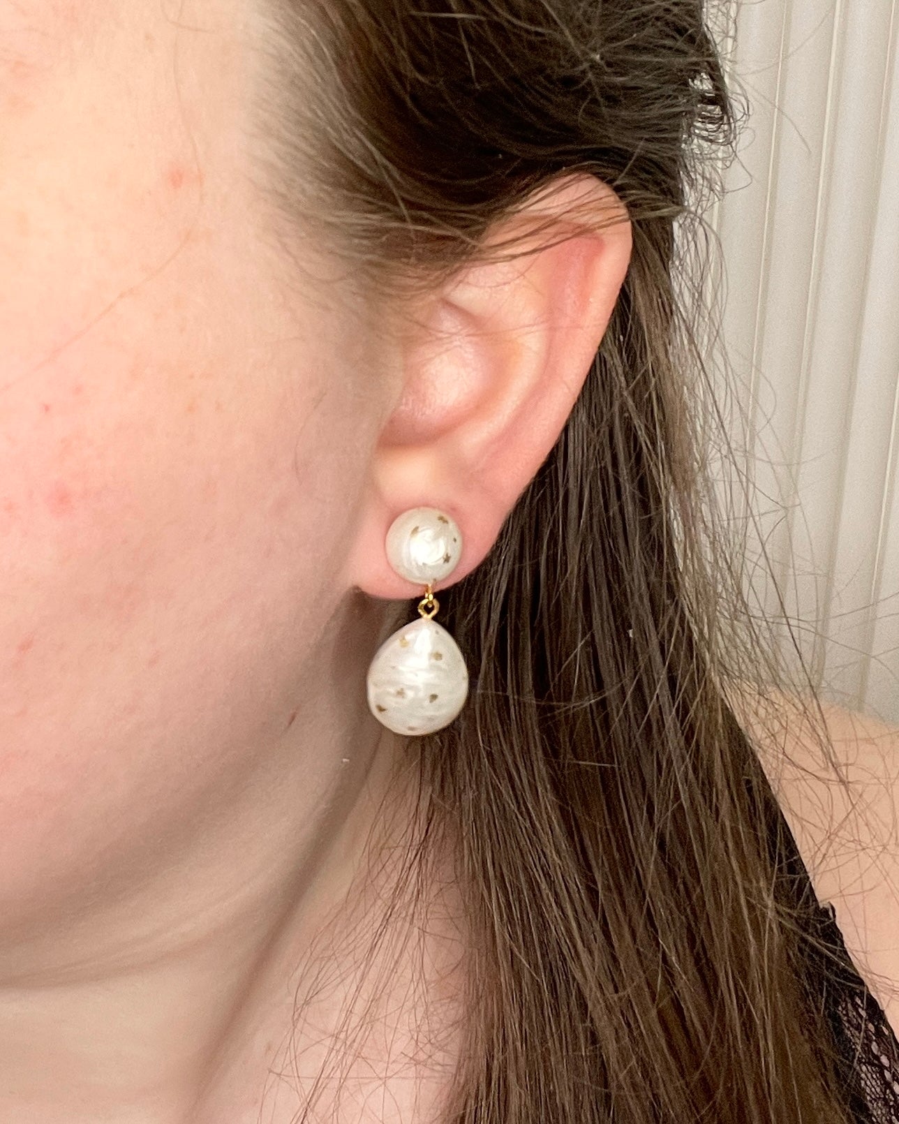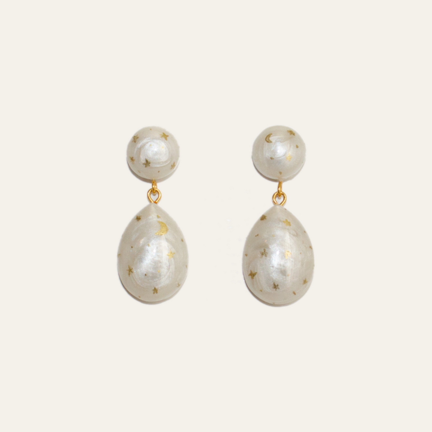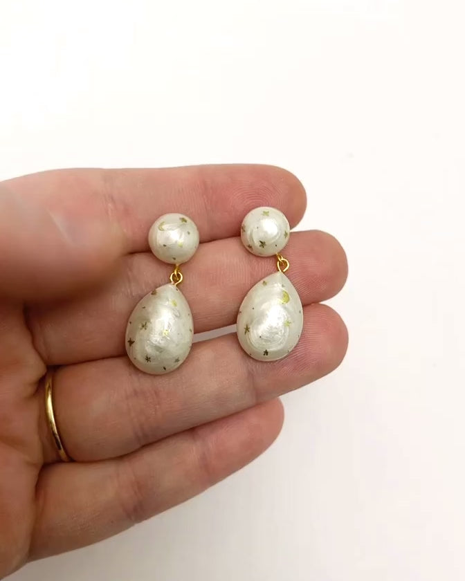 These earrings feature shimmery pearl domed beads with hand painted stars and moons. The way they move while you're wearing them is so magical, they're super lightweight and comfortable to wear all day long!