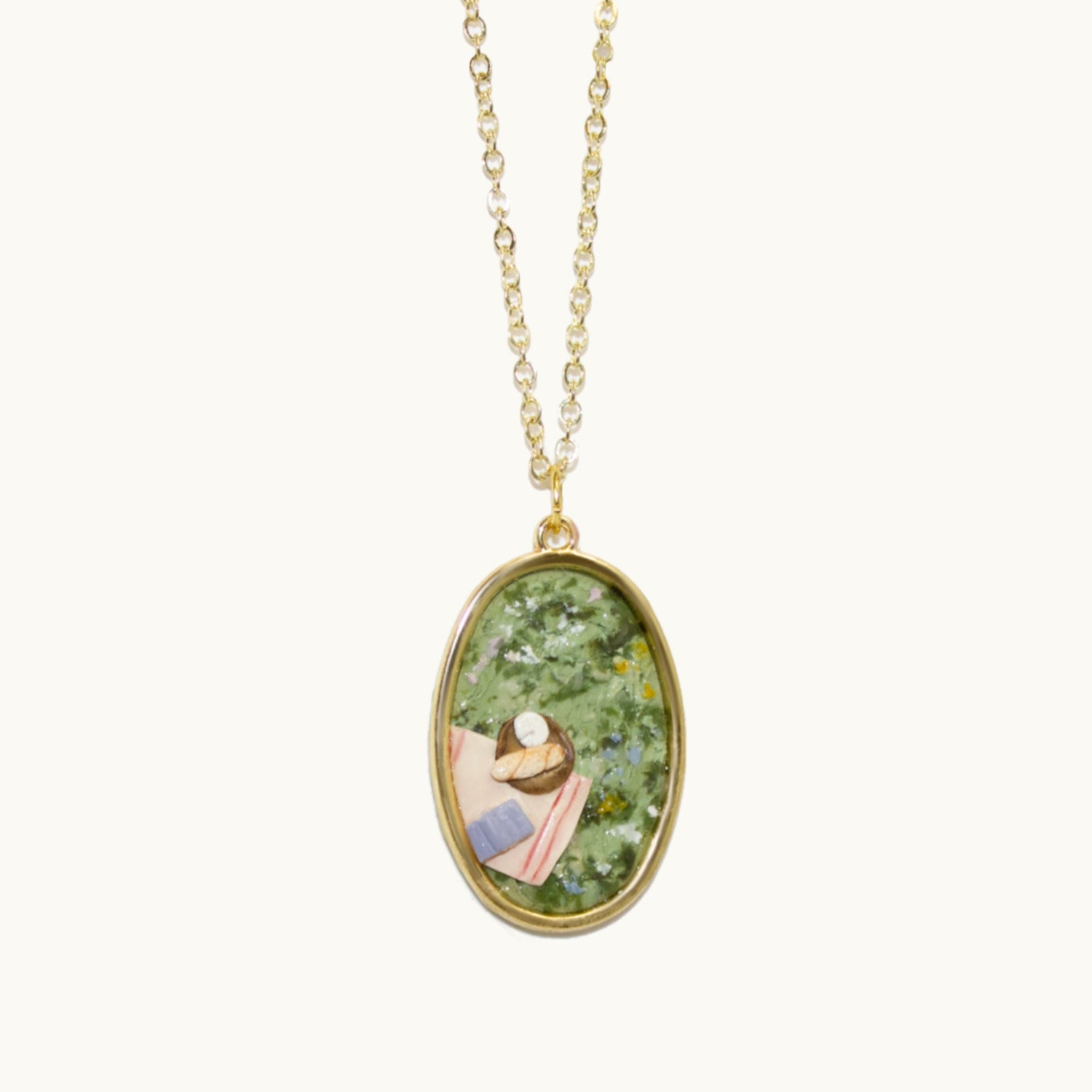 This necklace features the cutest little picnic scene, including charcuterie and a good book :)