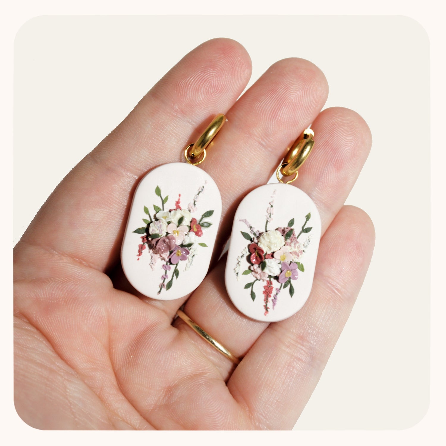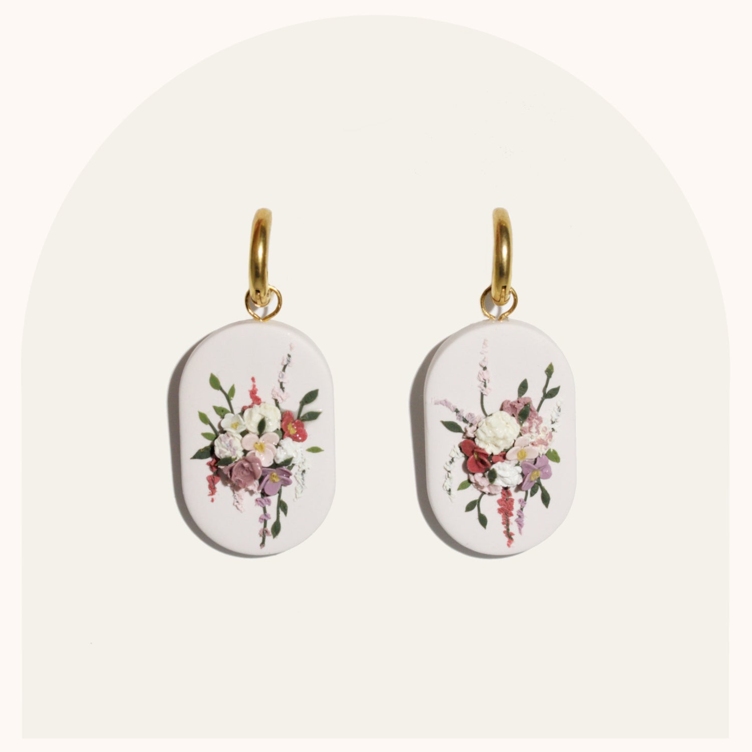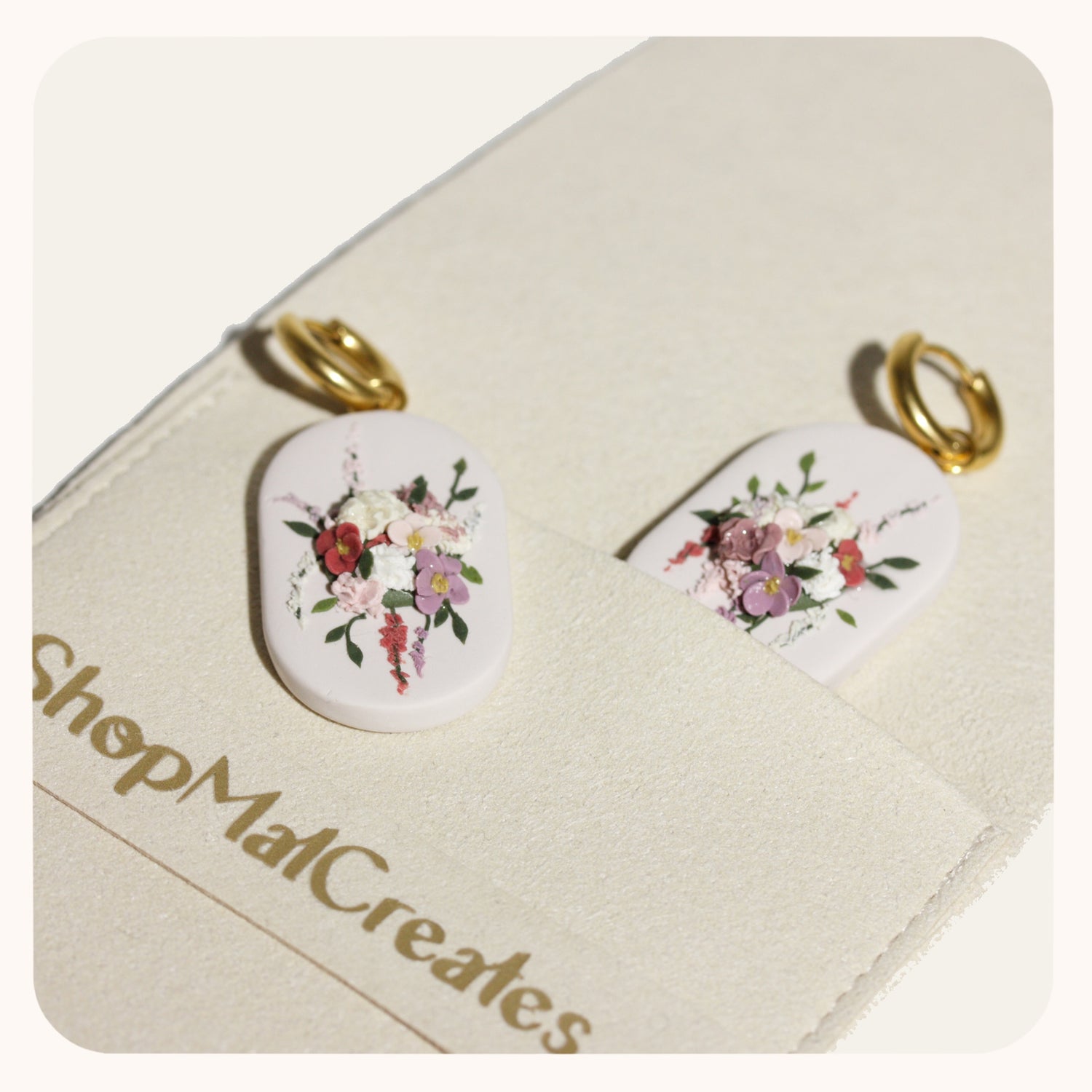 My bouquet earrings are so classic. Each pair is unique, you'll never find a pair that's exactly the same. I spend upwards of 2 hours placing each petal and leaf to make sure the bouquet is cohesive and beautiful.