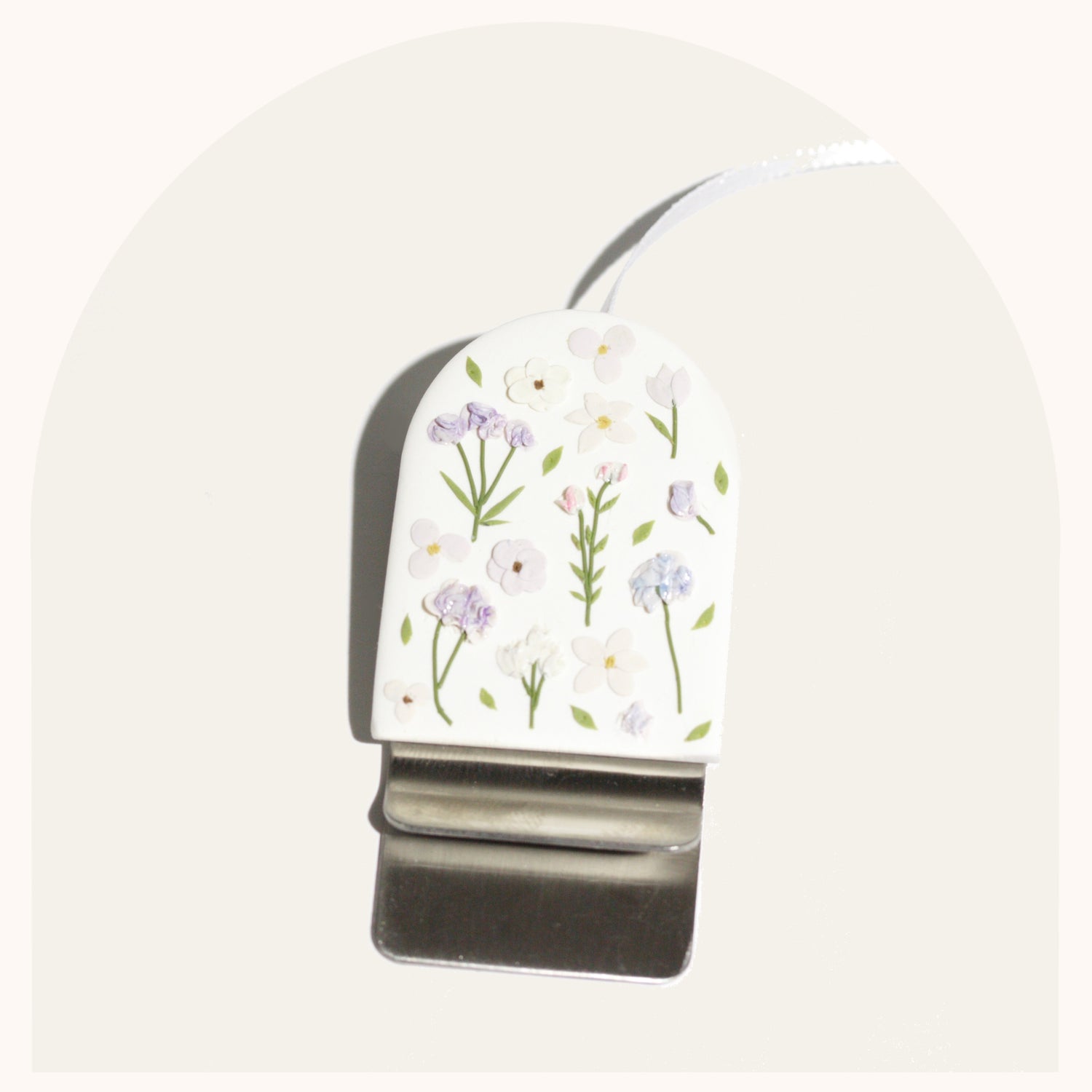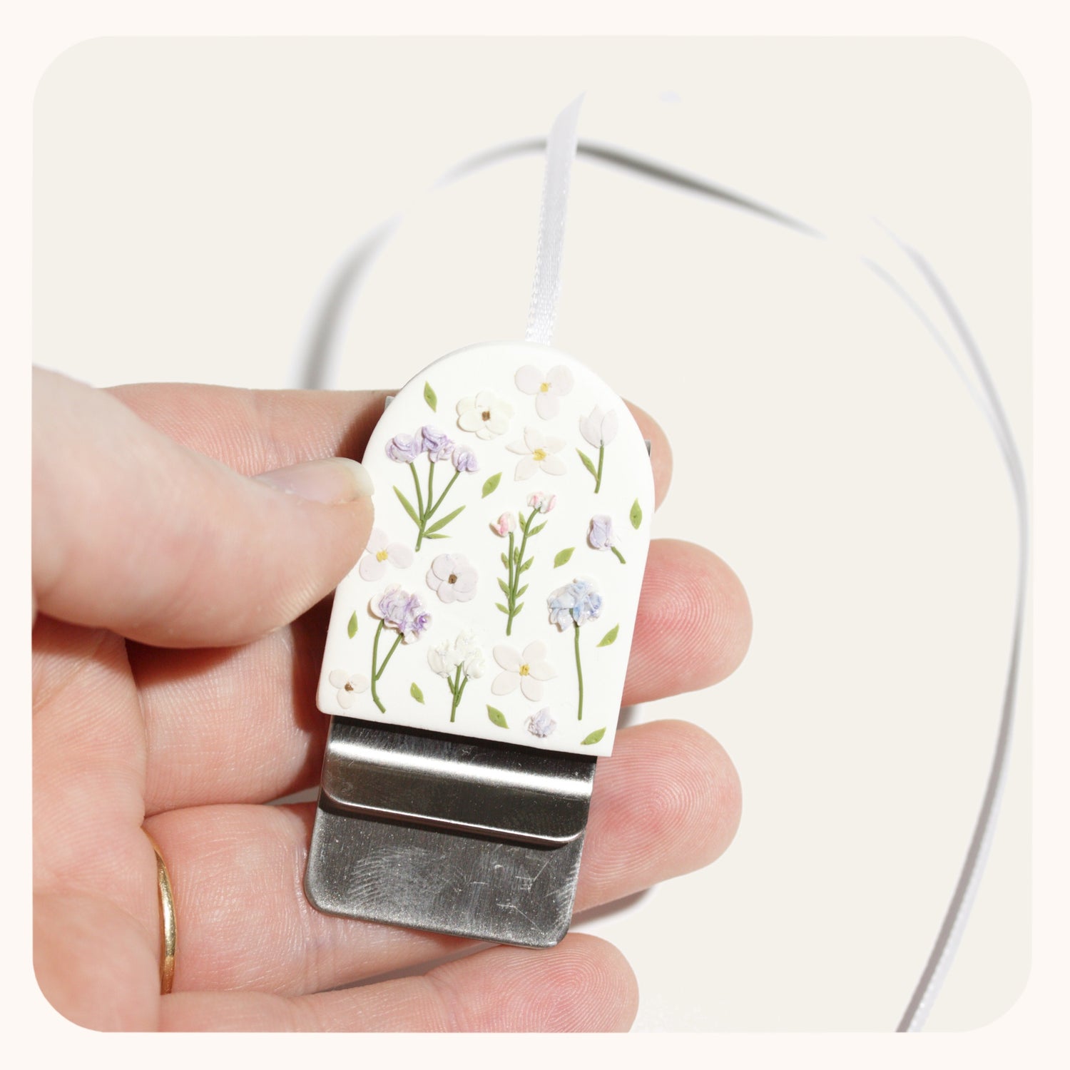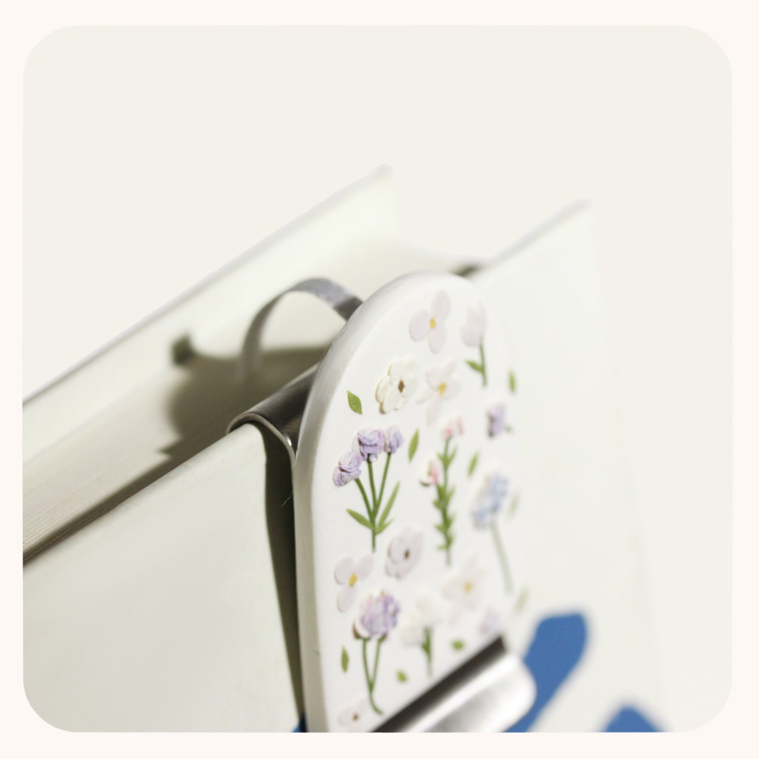 This book mark has a really strong clip that slides onto the cover of your book, and a ribbon to hold your place.