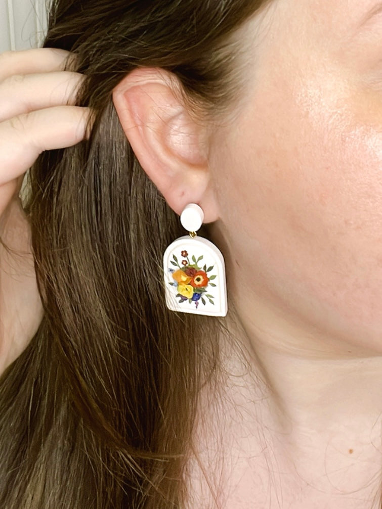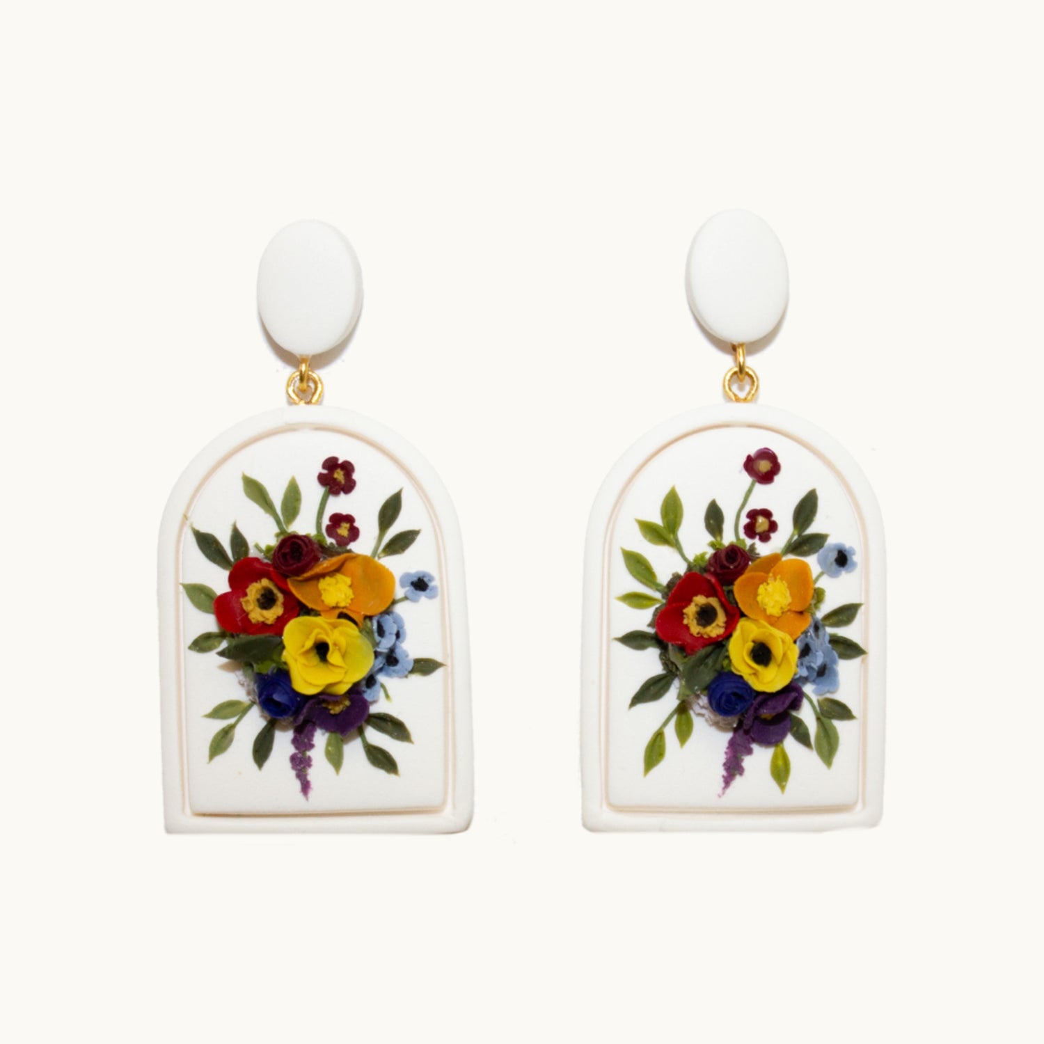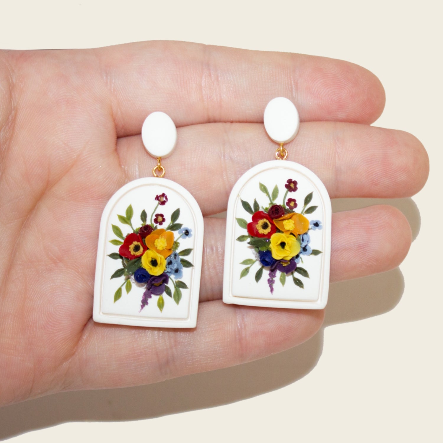 These bouquet earrings are so highly detailed, I put a ton of time and effort into them! The bouquet itself is made of roses, poppies, daisies and hydrangeas in all colors of the rainbow.