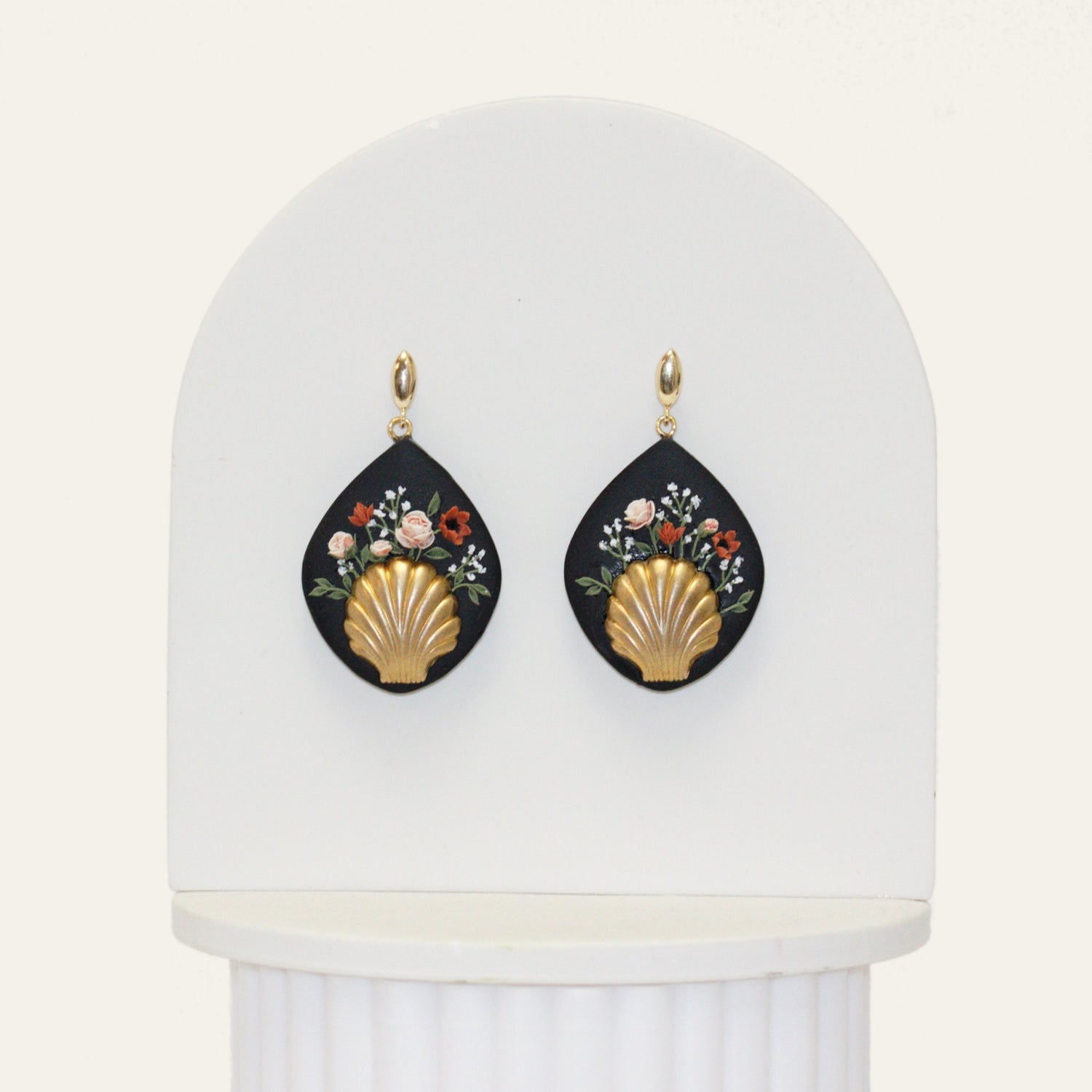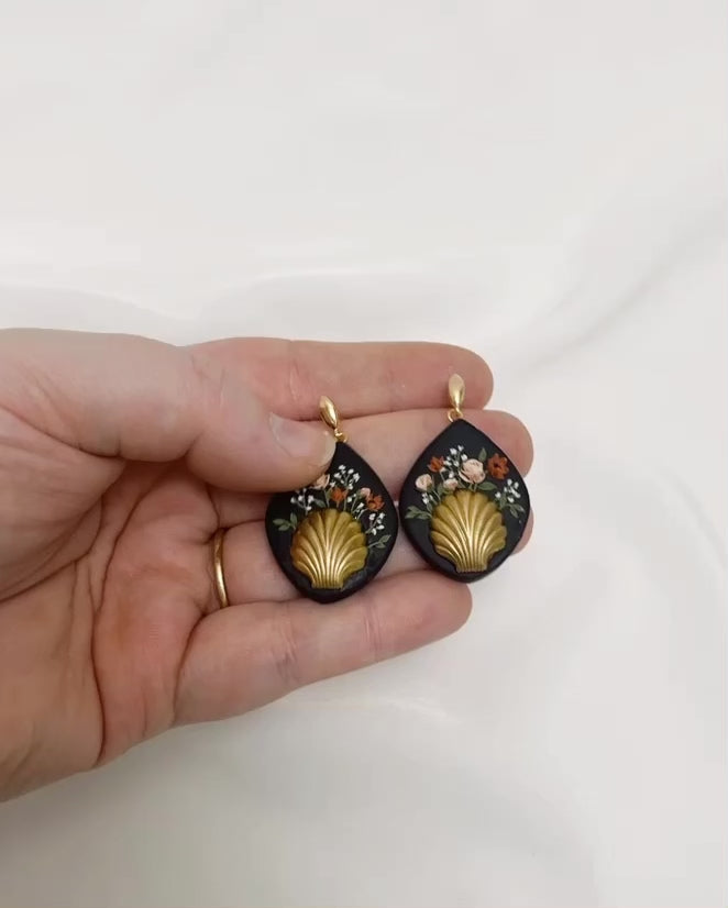 The earrings feature a bouquet of flowers that are coming out of this little bronze shell, almost like it's a vase! These were so inspired by antique brass vases and artwork. I also have a life-size brass shell vase that's so similar to this mini one.