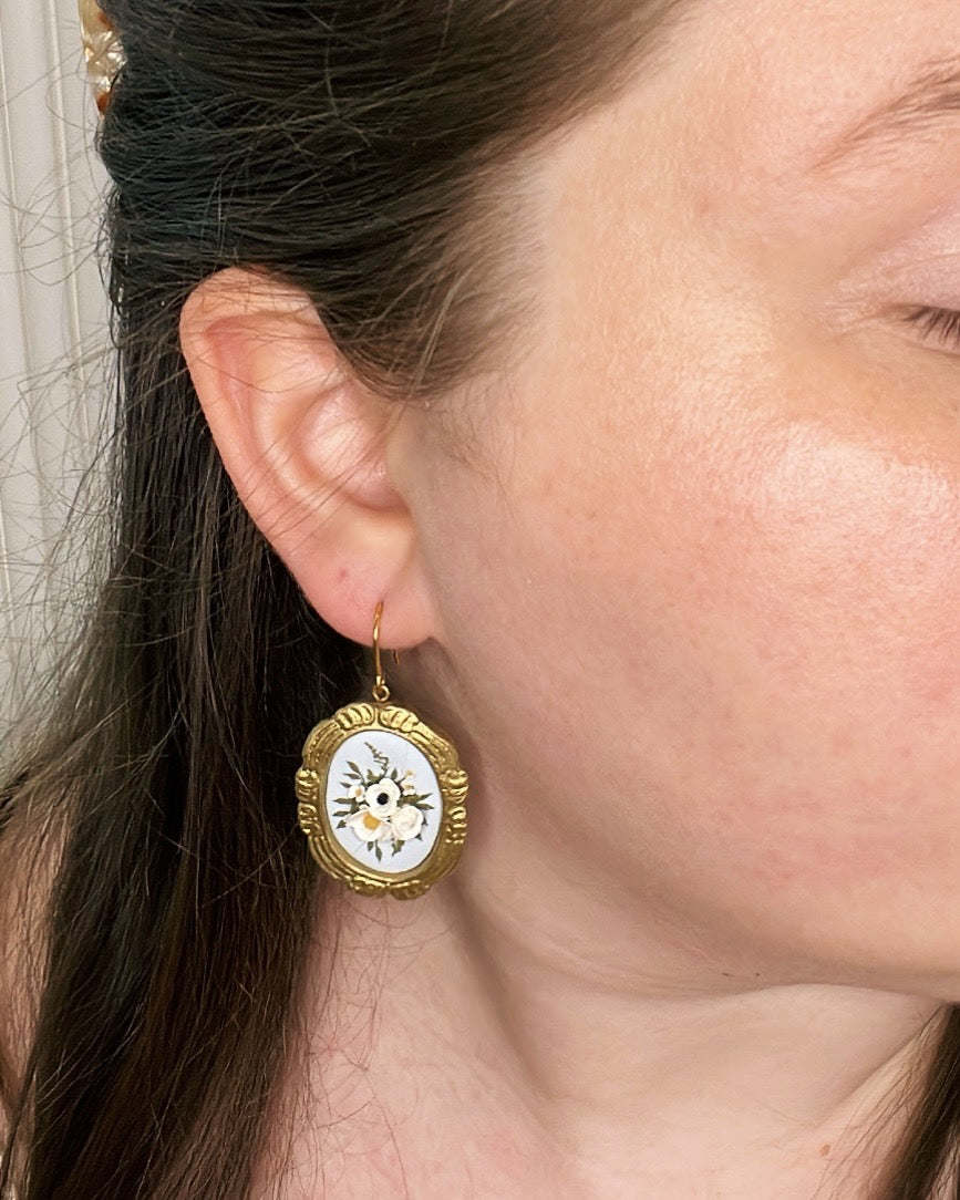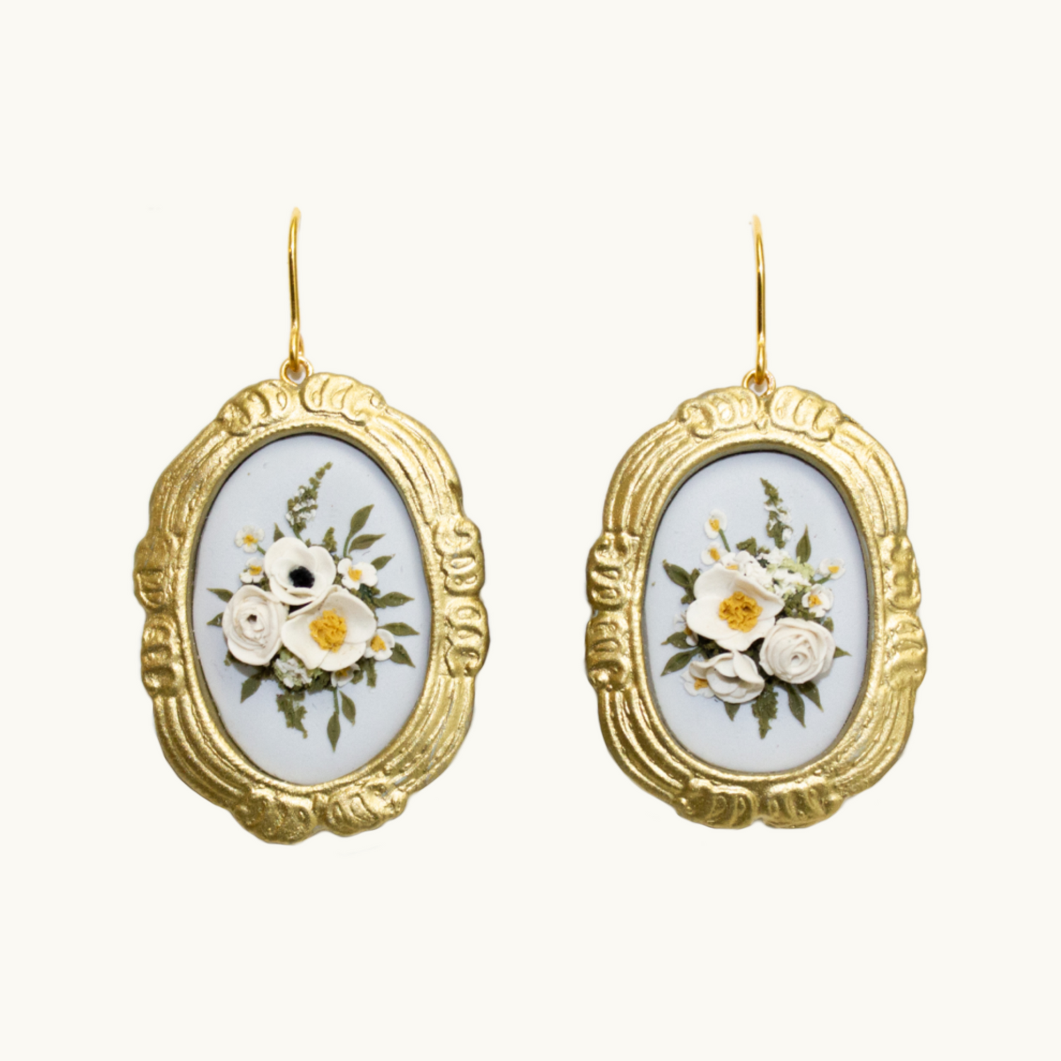 These earrings consist of a really beautiful pale blue base with a white floral bouquet. Of course, it's surrounded by a beautiful gold frame :)
