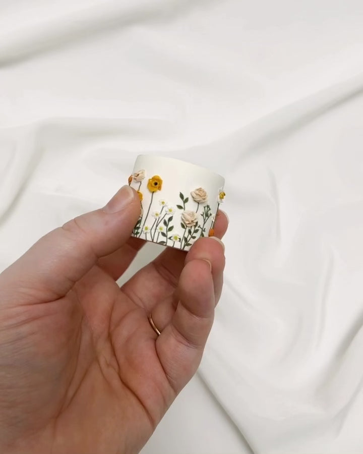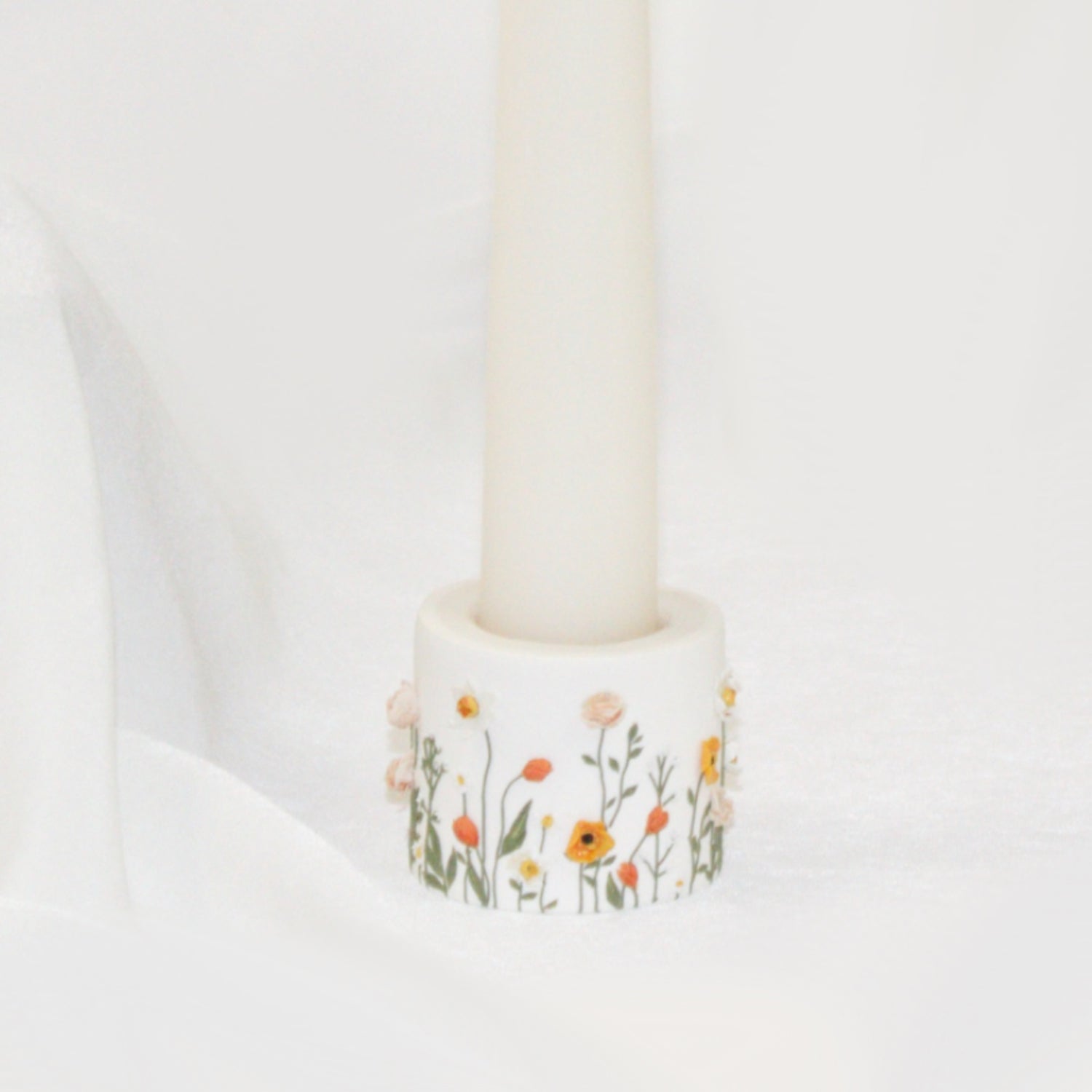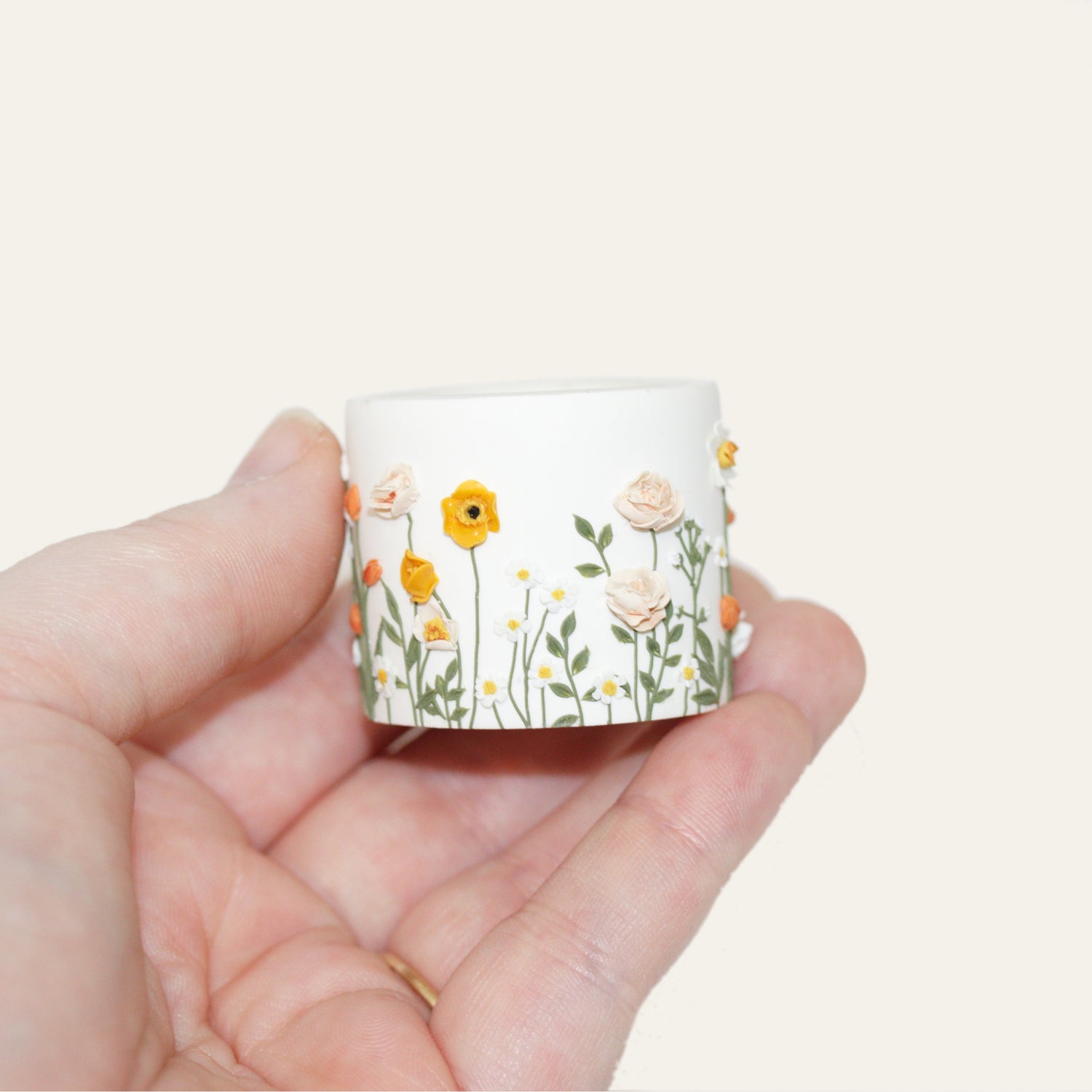 This particular one is a candlestick holder with beautiful florals all the way around it. I spent hours sculpting all of the flowers and stems, and I hope it brightens your day!