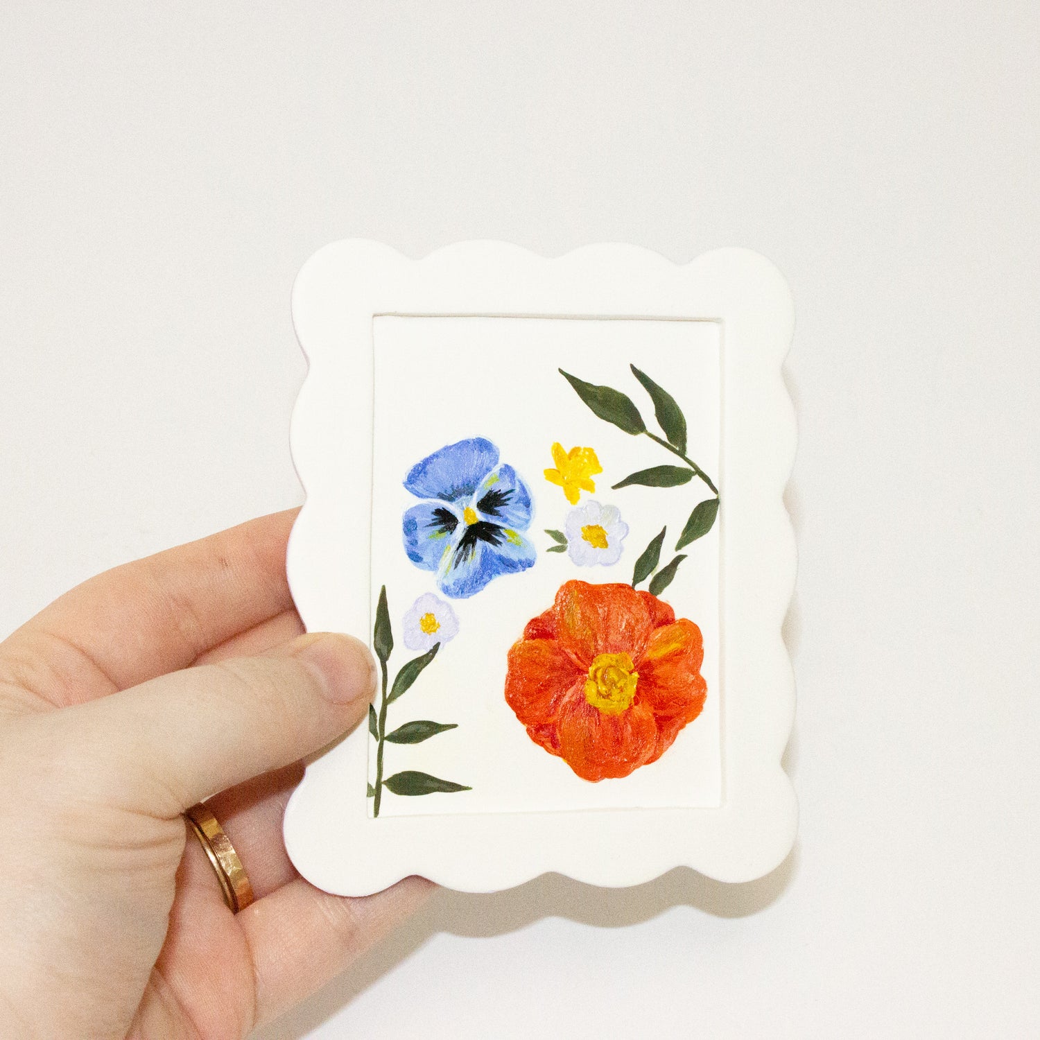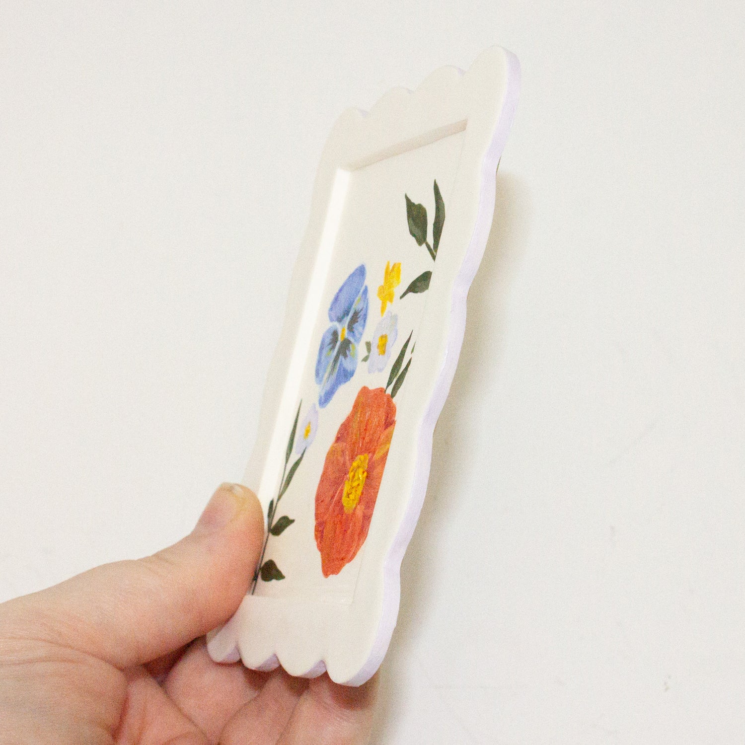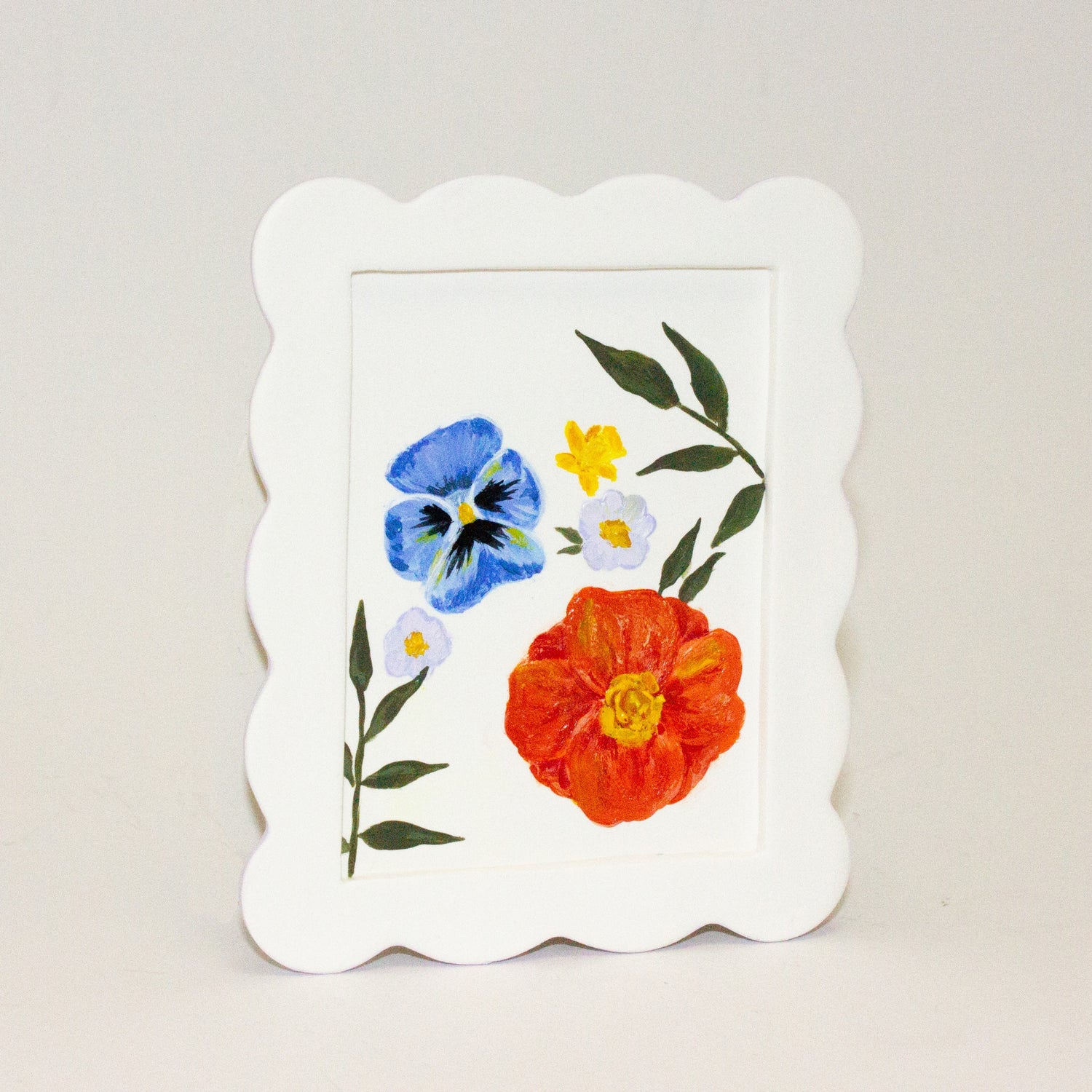 This original painting features a pansy, poppies, and a daffodil surrounded by foliage on a white clay frame! The edges are also painted lilac :)