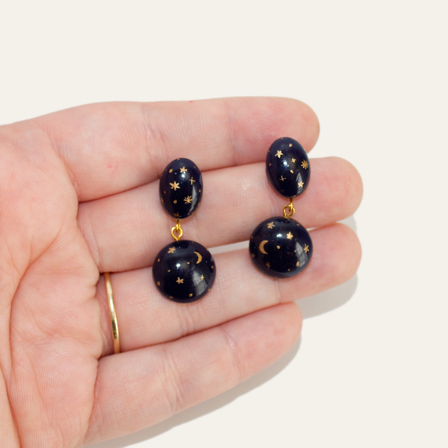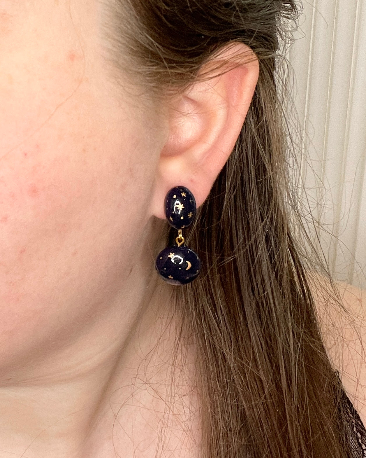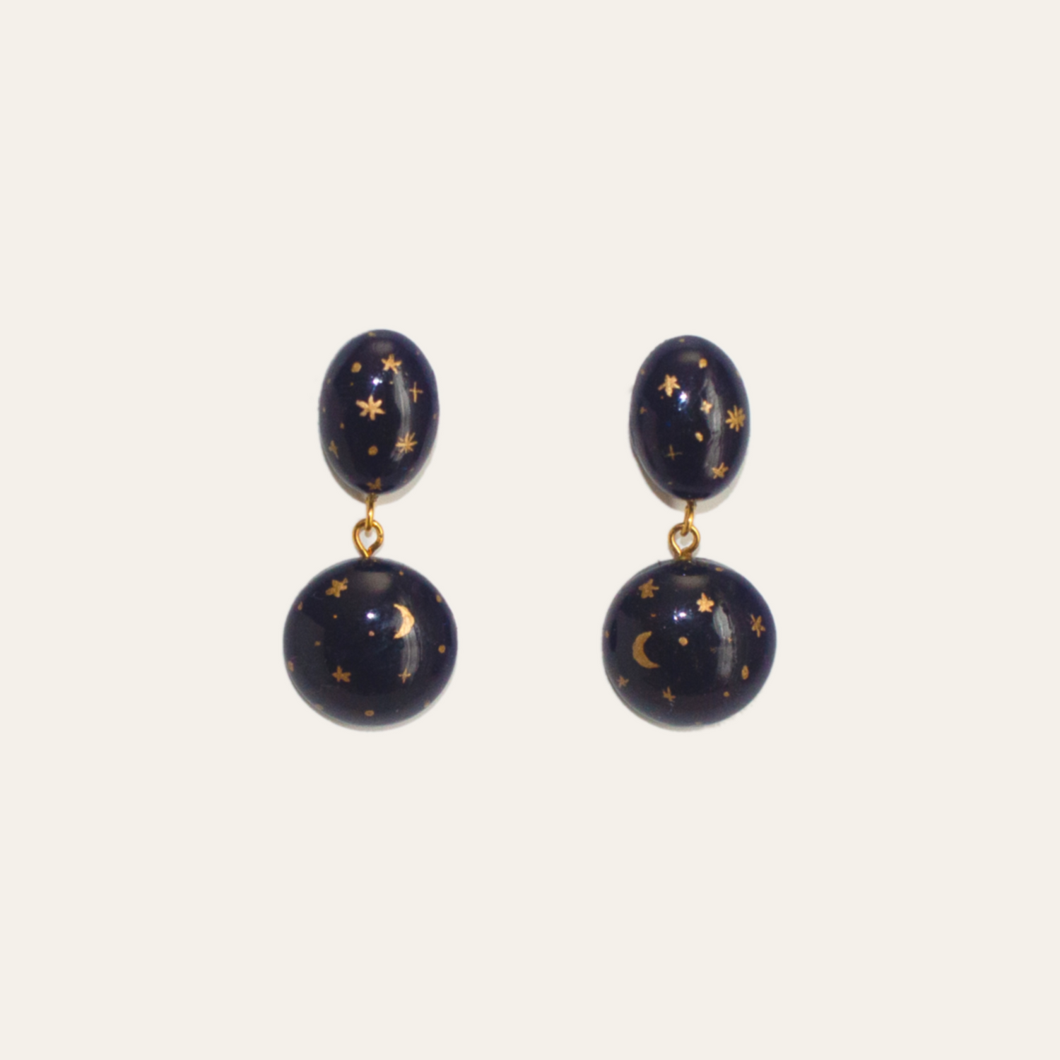 These earrings feature deep navy, domed beads with hand painted stars and moons. The way they move while you're wearing them is so magical, they're super lightweight and comfortable to wear all day long!