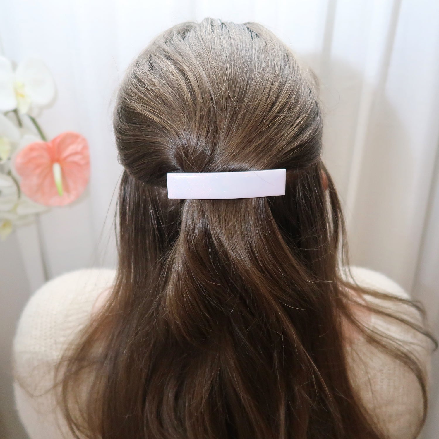 - French barrettes come in 3 inch and 4 inch sizes. Each can hold a lot of hair, or they can be pinched in further to hold thinner hair (demonstrated in the video!)