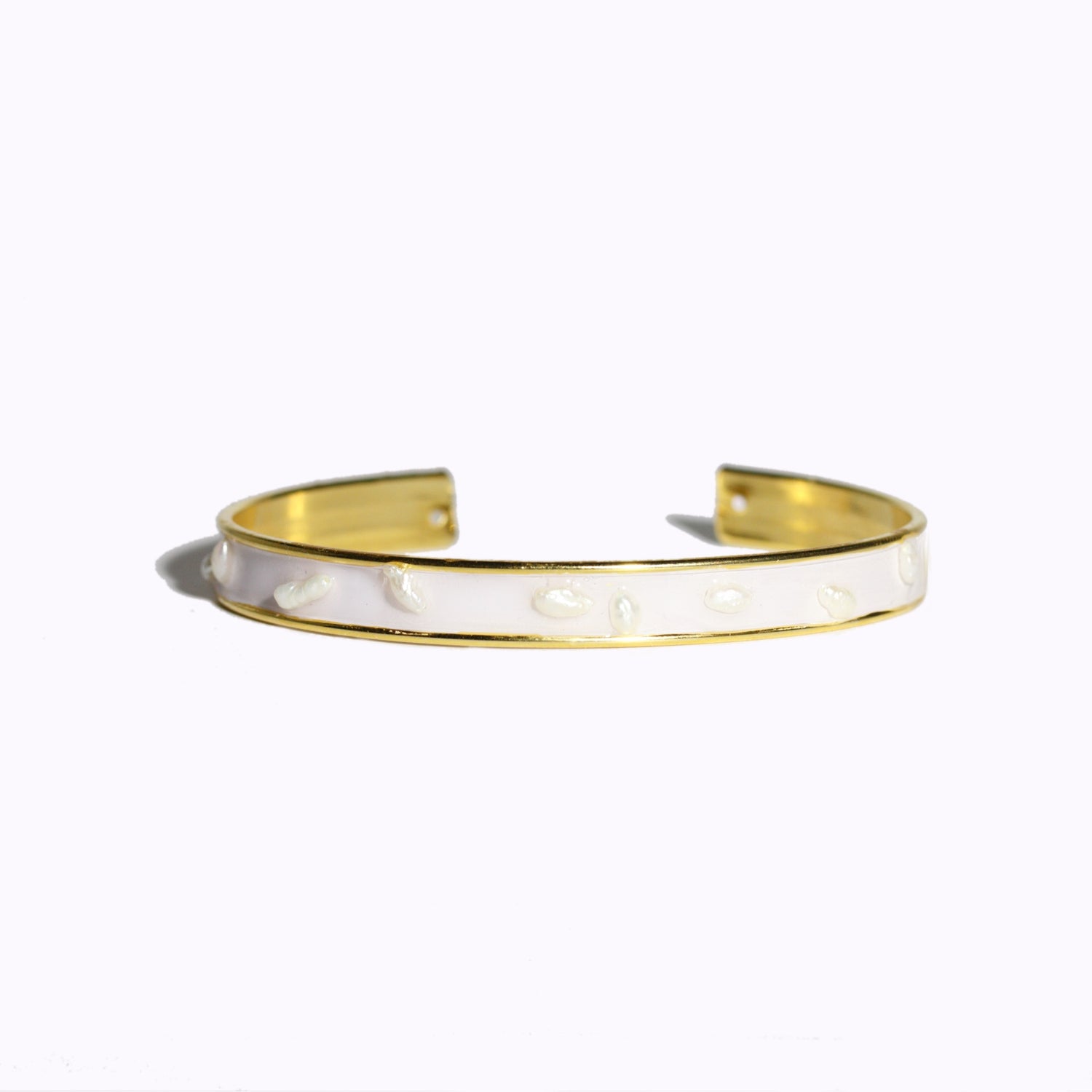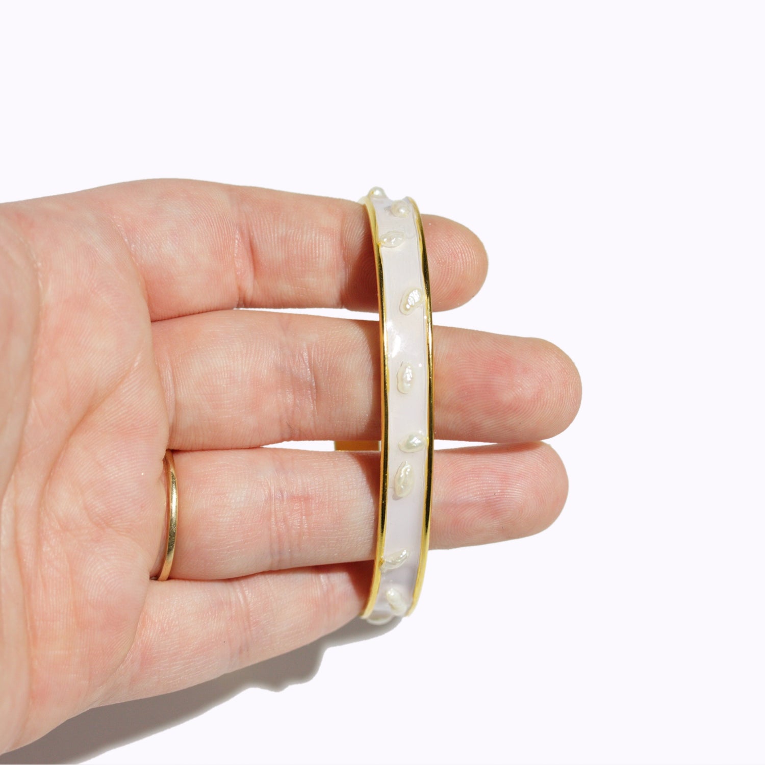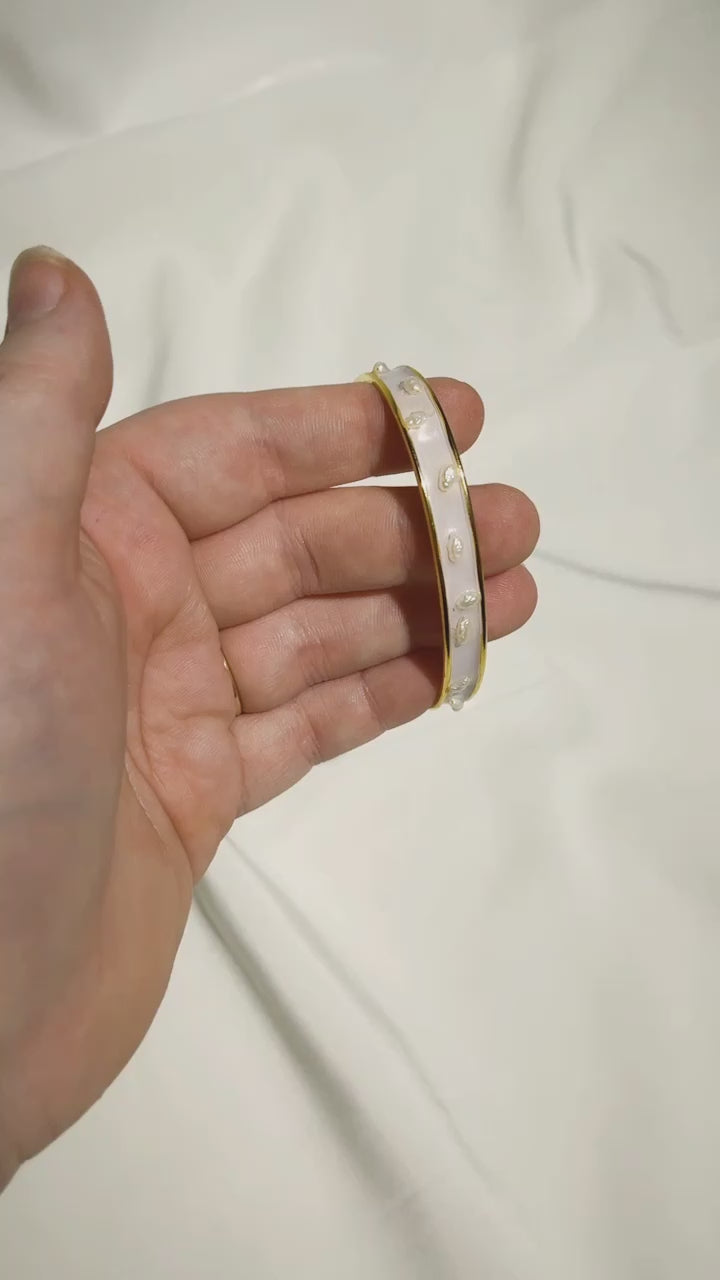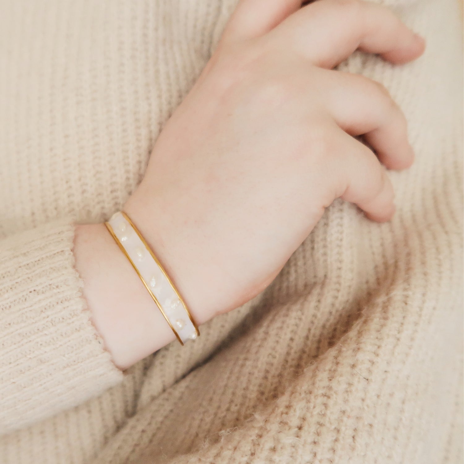 The bangle itself is fairly flexible and gold plated. It can adjust to fit your wrist if needed! The inside is painted a very light, dusty lavender color and coated in a crystal clear top coat.