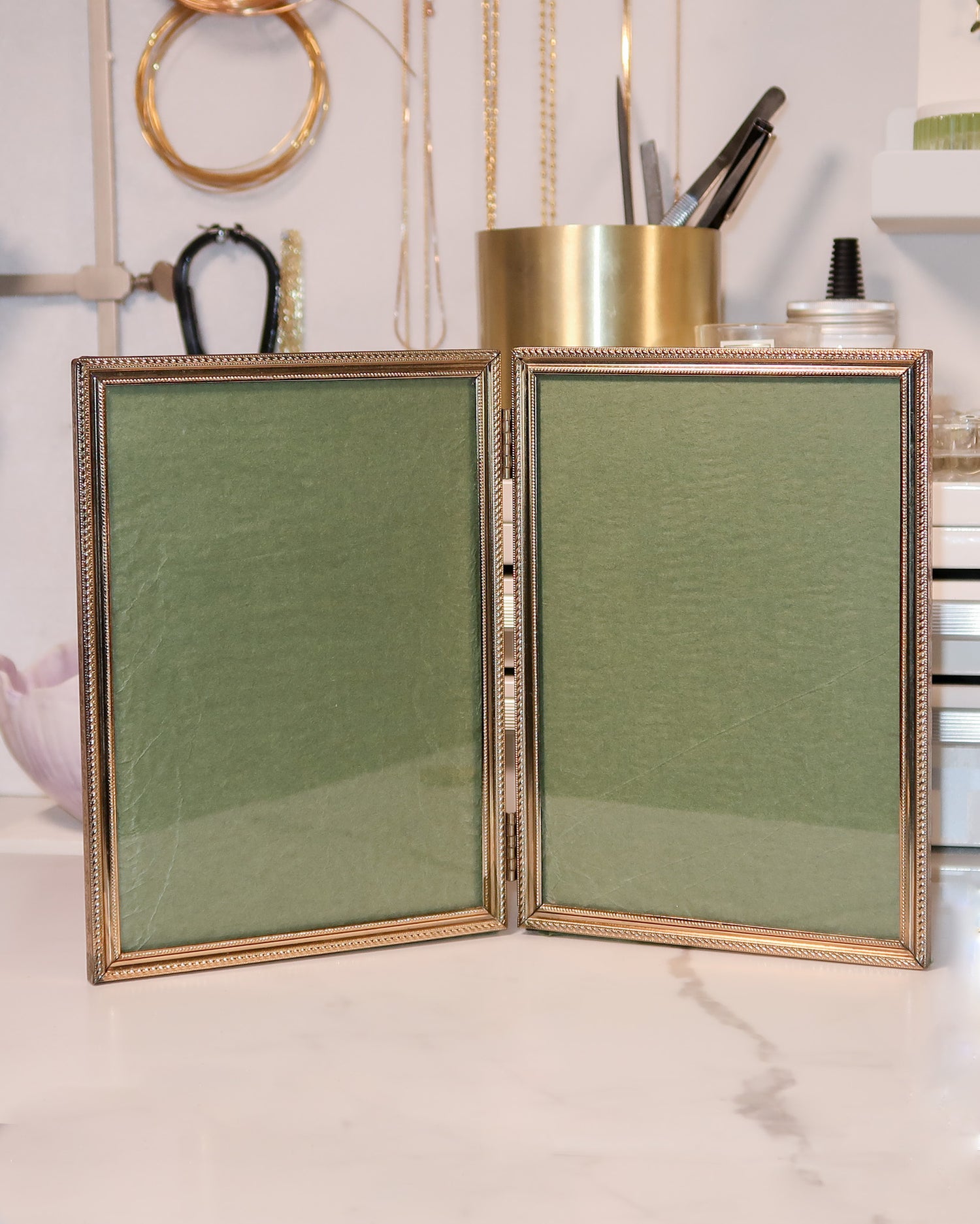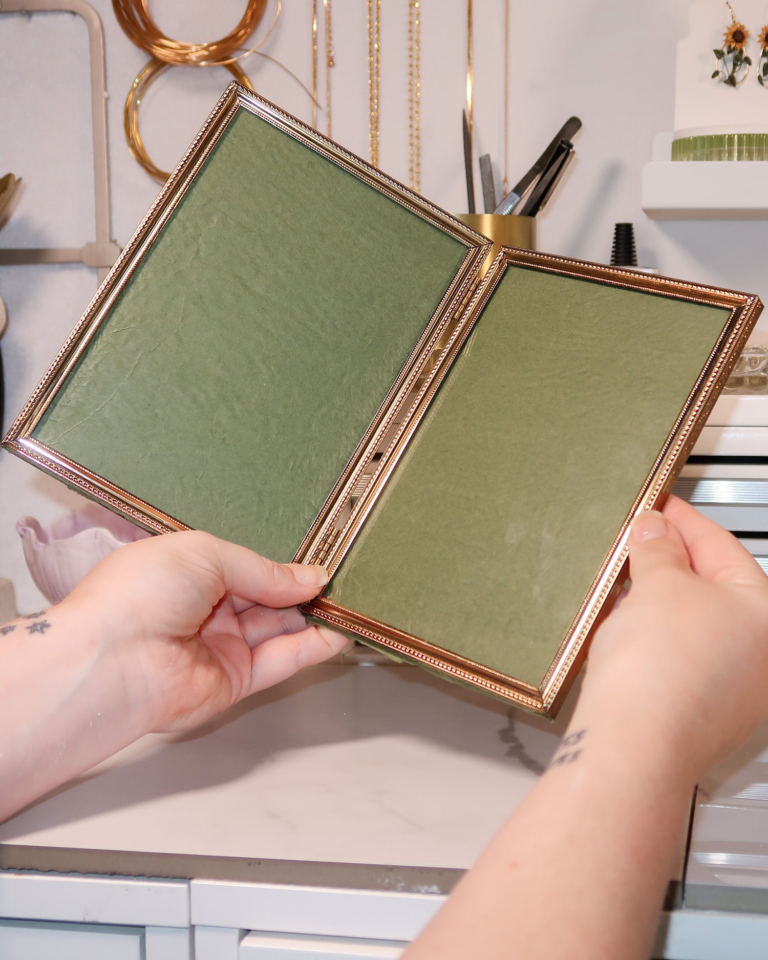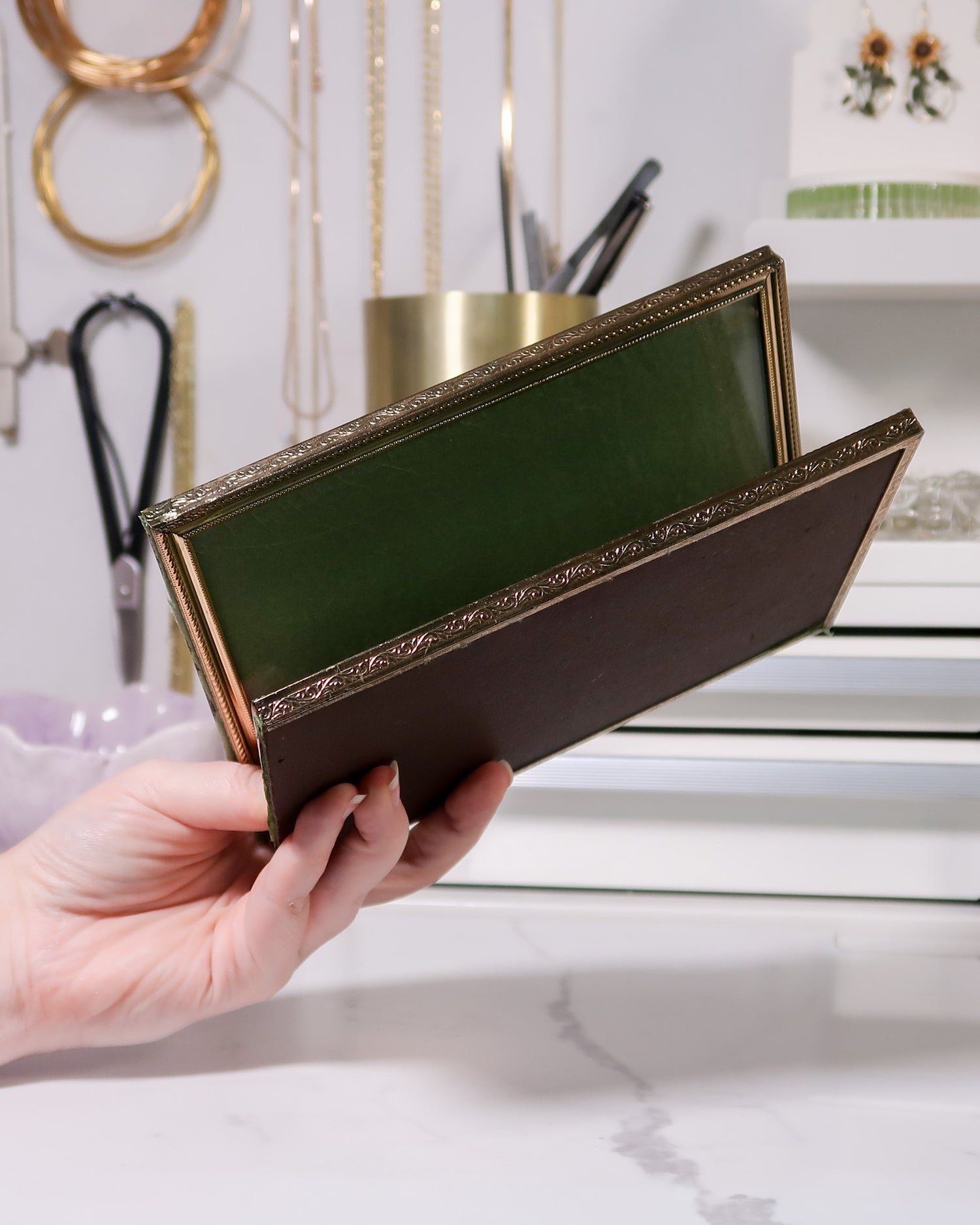 Gosh, this frame is a beauty. it's a vintage, double-pane, gold-toned frame with gorgeous raised details covering every inch. Can you imagine passing this in your home? getting to look at your hand-sculpted bouquet, opposite a special picture that brings you back to that memory? It just sounds like a dream.