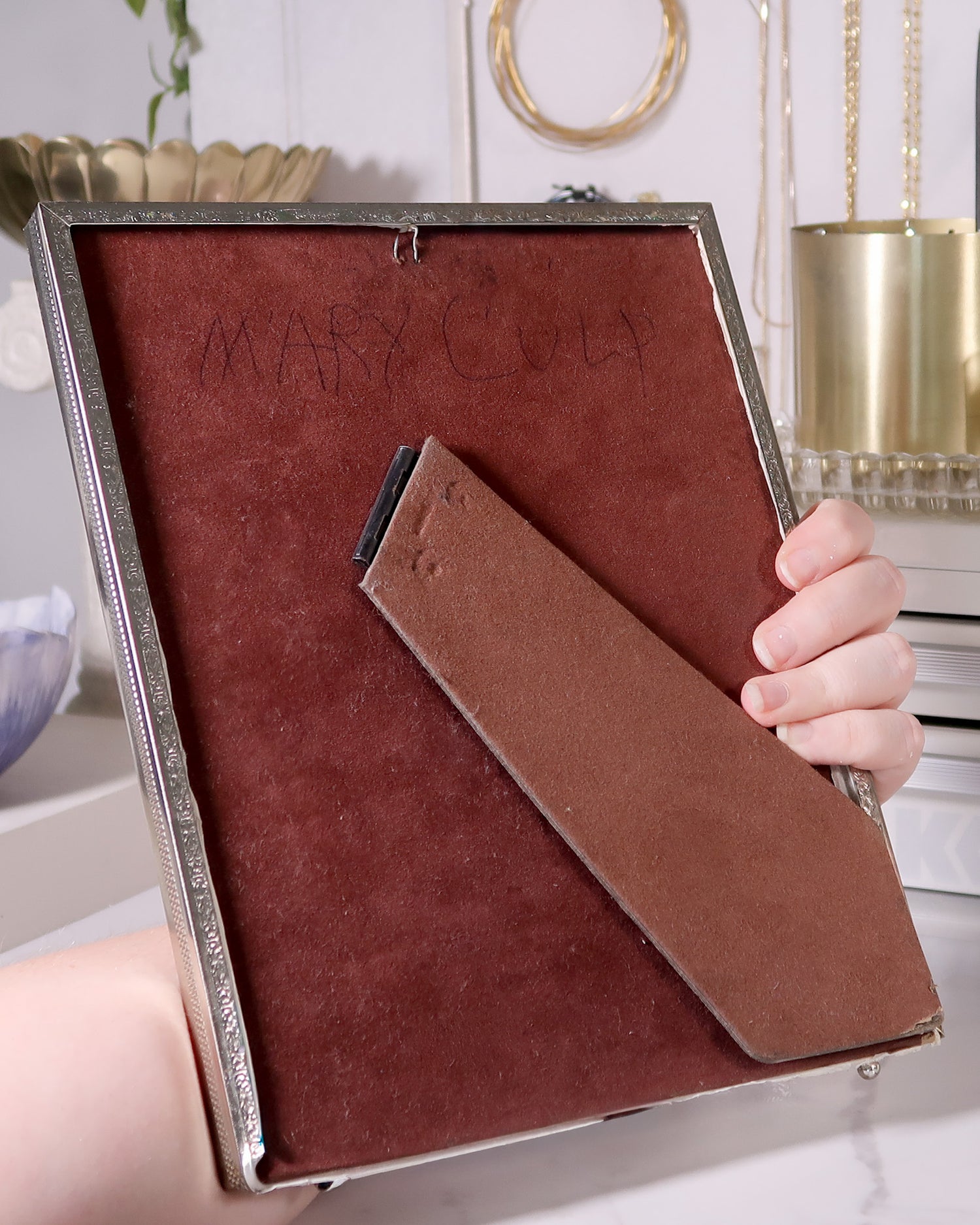 This frame is vintage and obviously was adored by someone in it's previous life! The frame itself is silver-toned with gorgeous ornate details. It has two adorable round feet at the bottom, which is a vintage detail I LOVE. The back is a reddish/tan colored velvet and does have some wear from the previous owner.