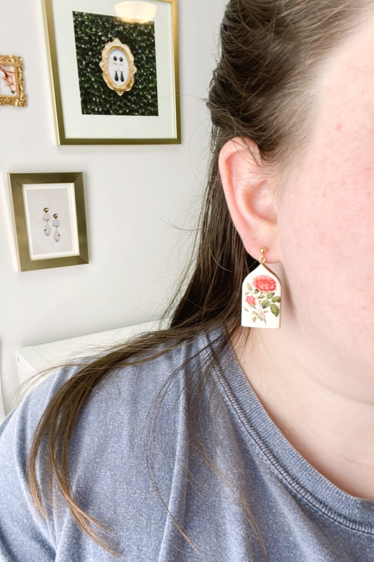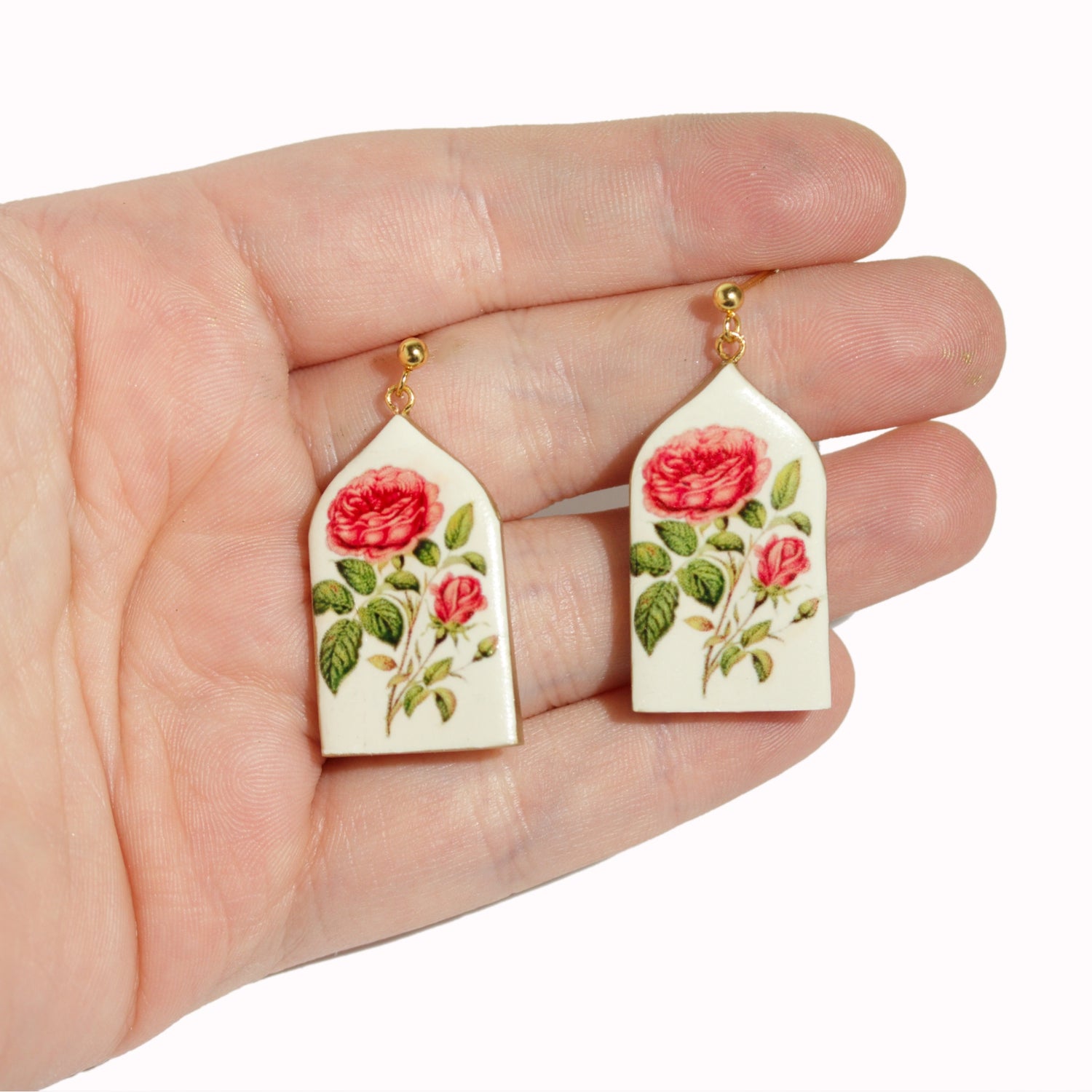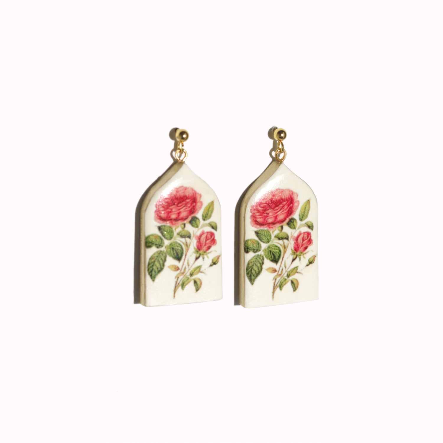 This design features a beautiful antique rose painting on a cream polymer clay base, with gold painted edges.
