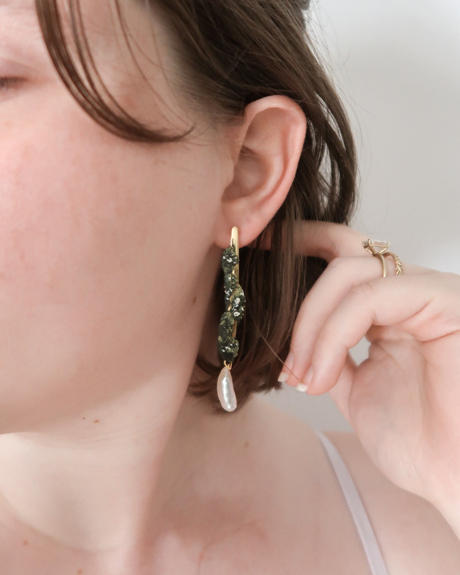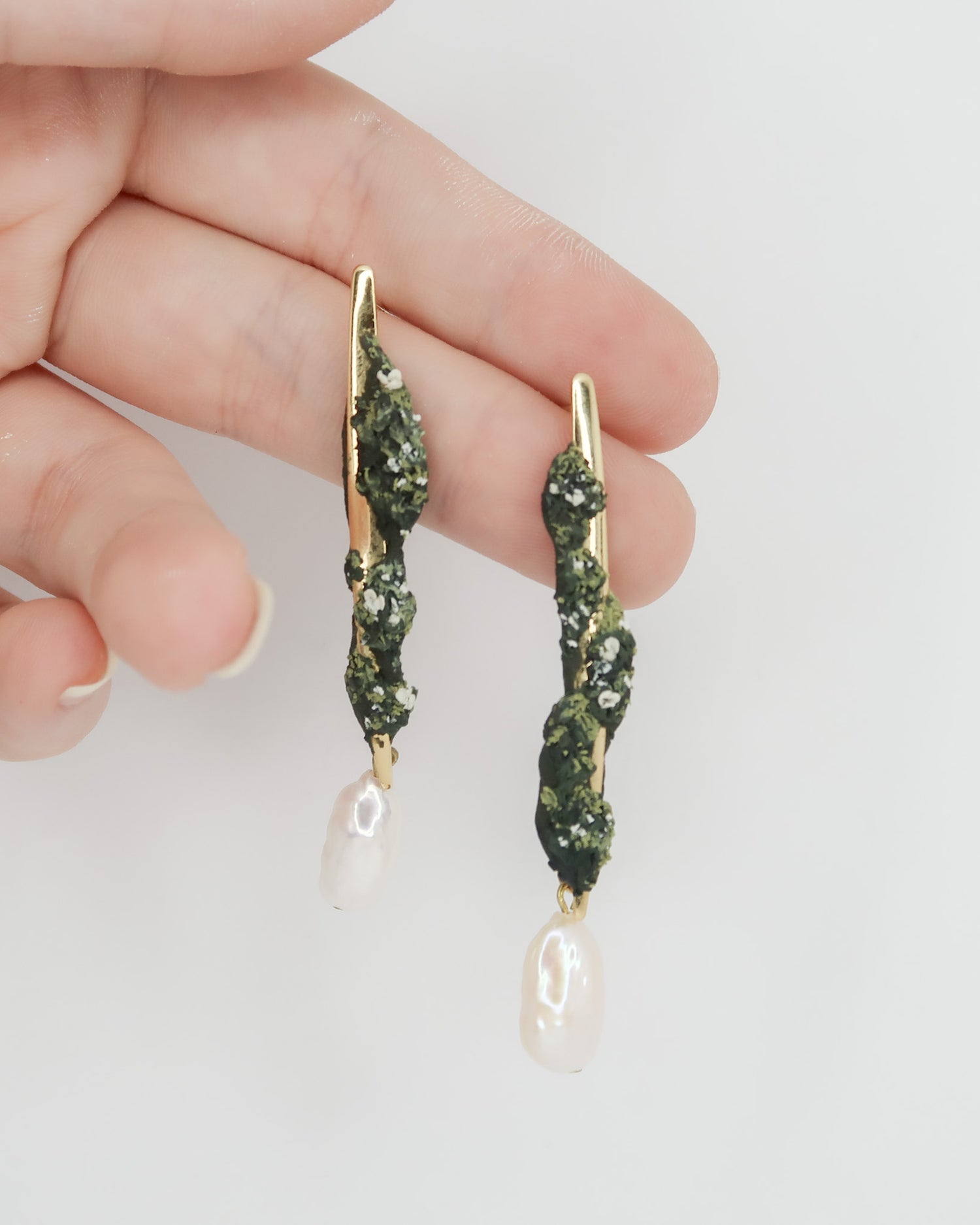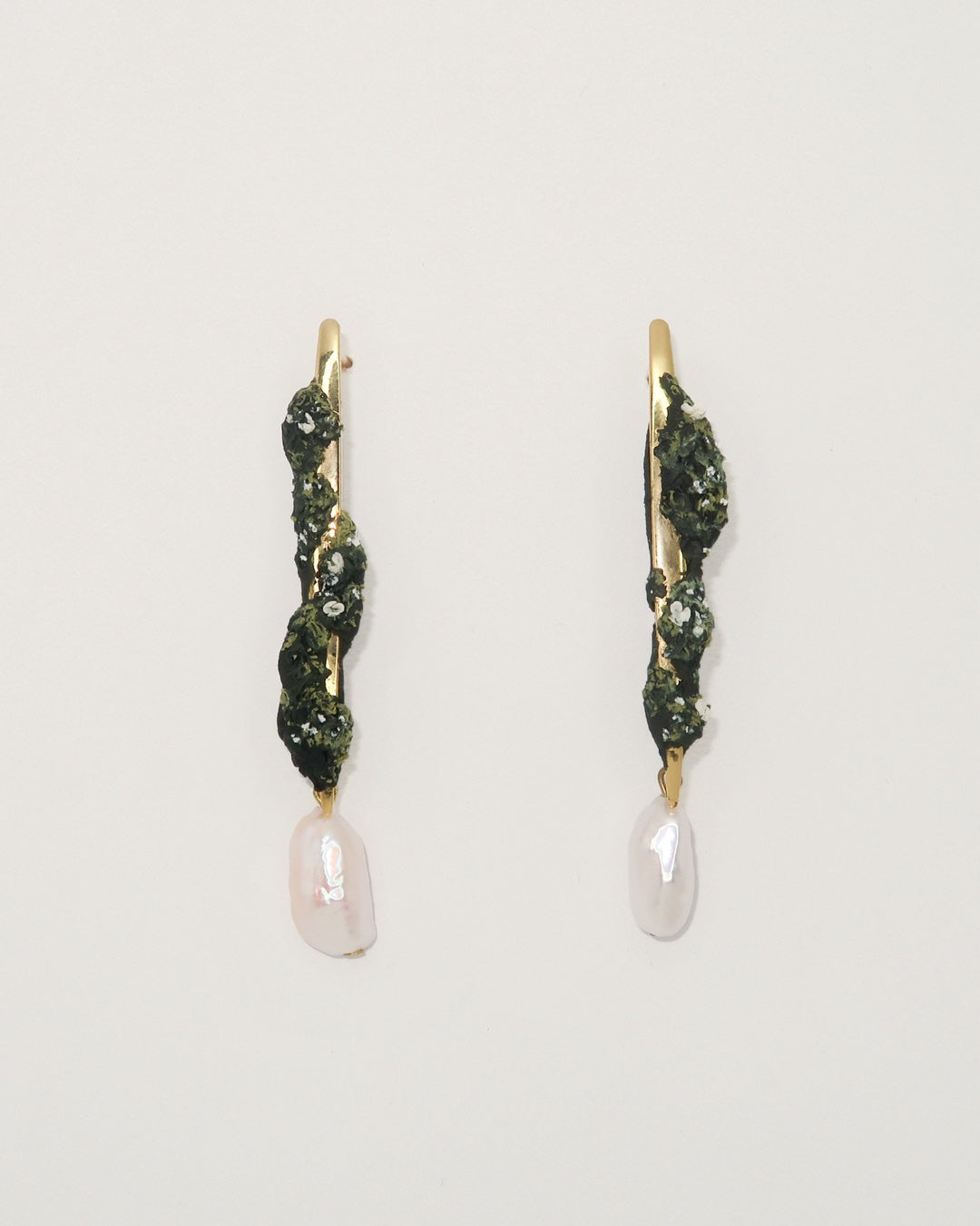Materials- gold plated earring component, polymer clay, sealant, gold filled wire, freshwater pearls.